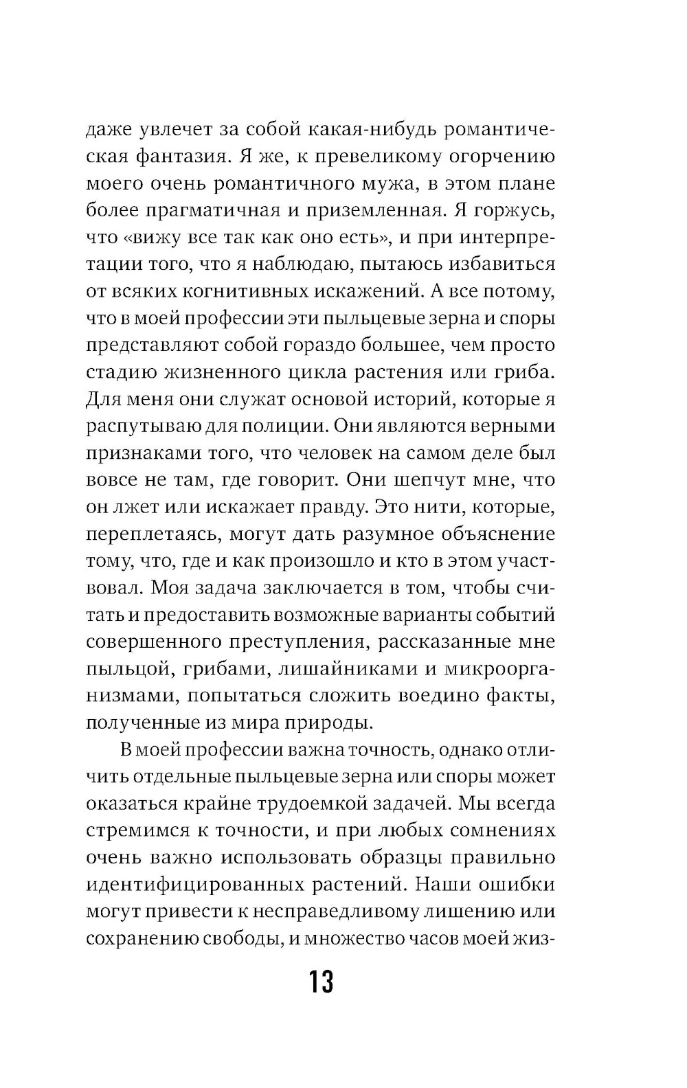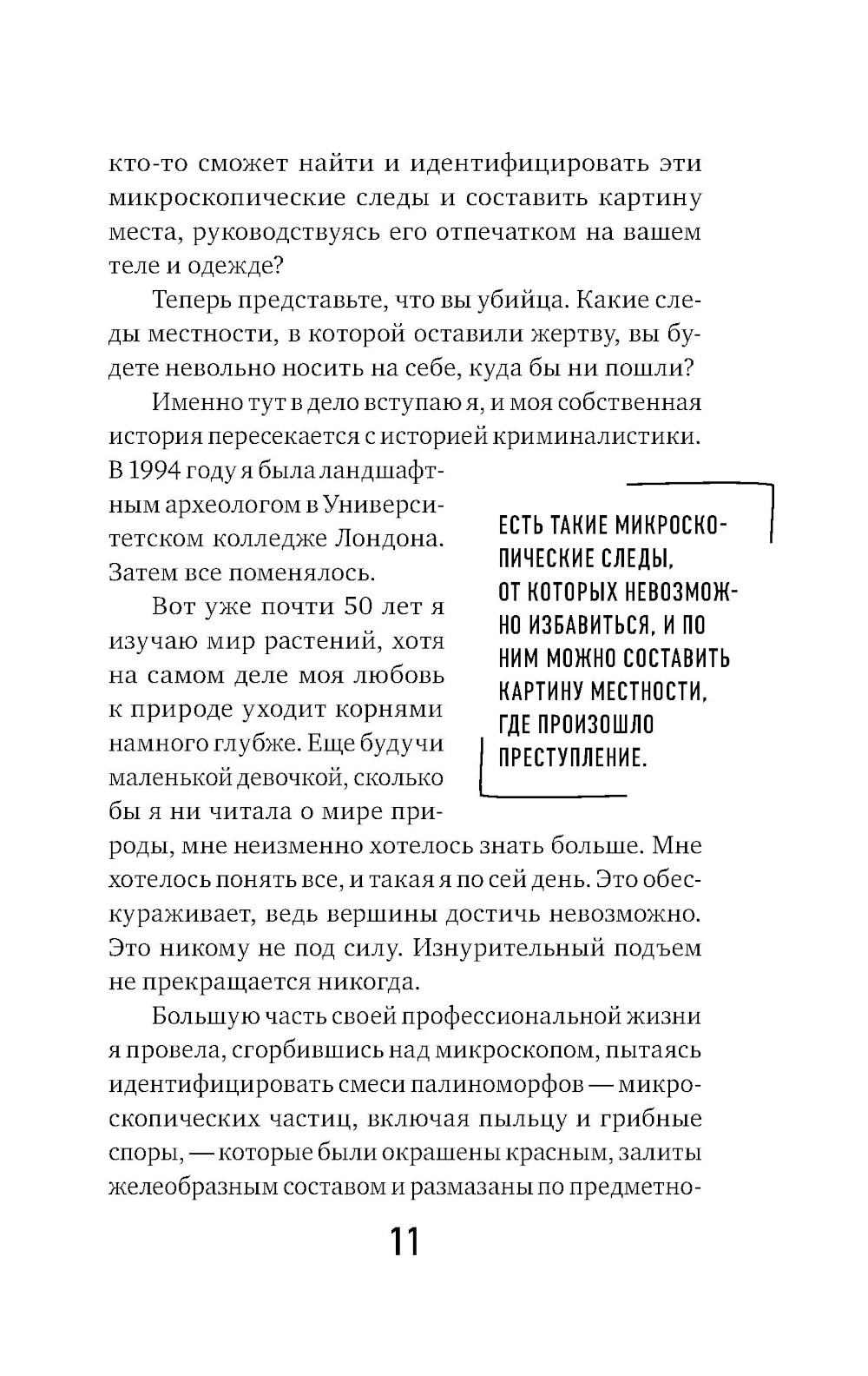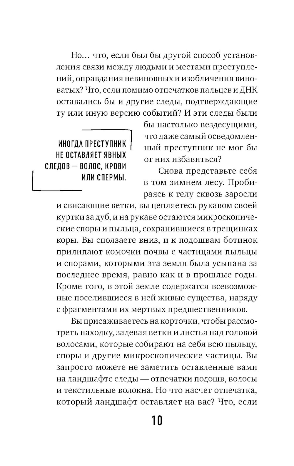 Мир окружающей природы всегда хранит следы нашего присутствия, являясь безмолвным свидетелем событий и происшествий, в том числе и самых страшных. Книга Патриции Уилтшир, первоклассного судебного эколога, проведет вас по сумрачной заболоченной пустоши в поисках спрятанного тела и даже заведет в жуткую квартирку, где пропитанные кровью ковры помогут определить время смерти жертвы. Это удивительная история университетского профессора и одного из самых востребованных в мире консультантов. Вы удивитесь, как много растения, пыль или следы на проселочной дороге могут сказать об обстоятельствах преступления человеку, чья работа - разгадывать головоломки, скрывающиеся в недрах леса и земли, в складках одежды и на ветвях деревьев.| Издательство | Эксмо |