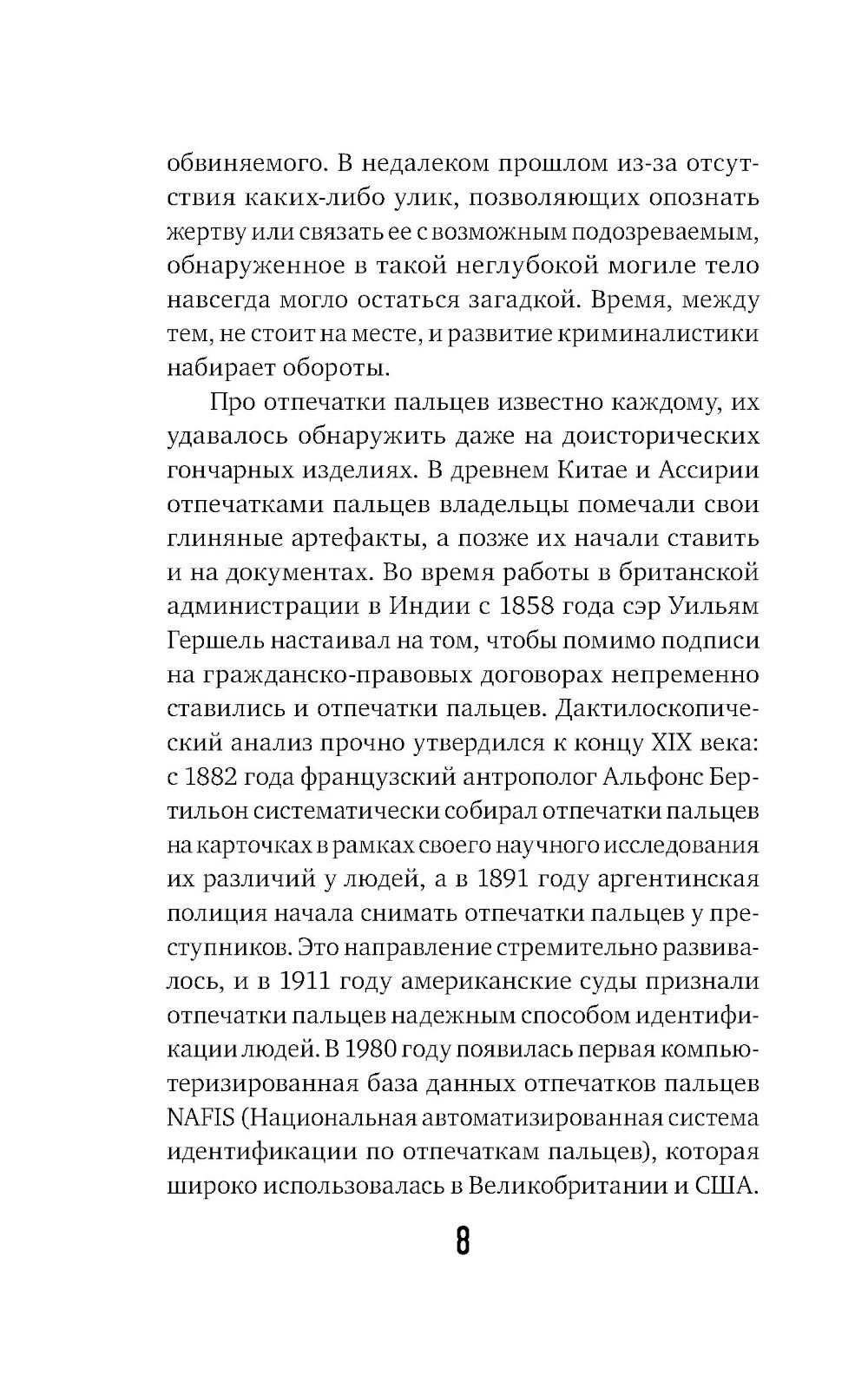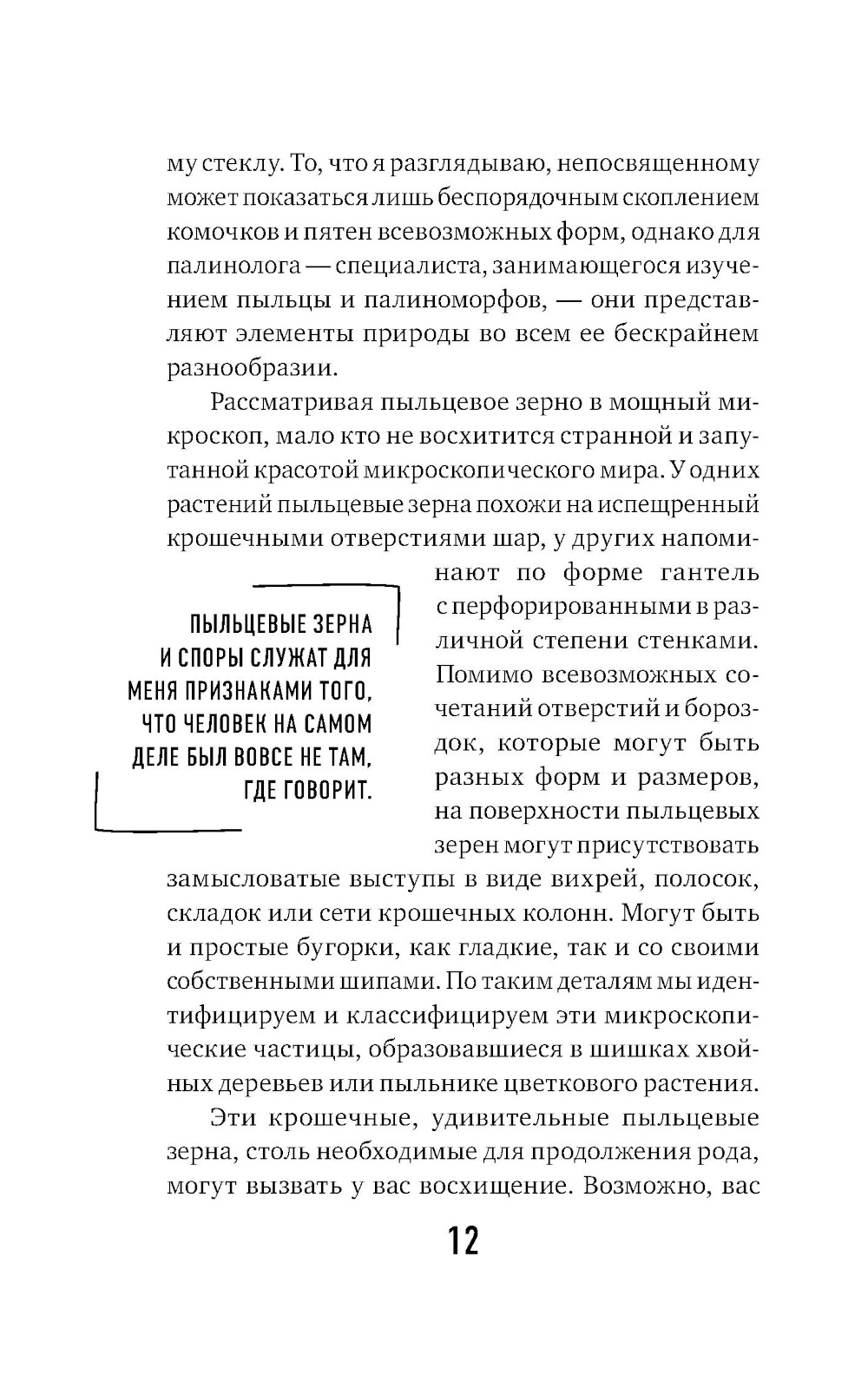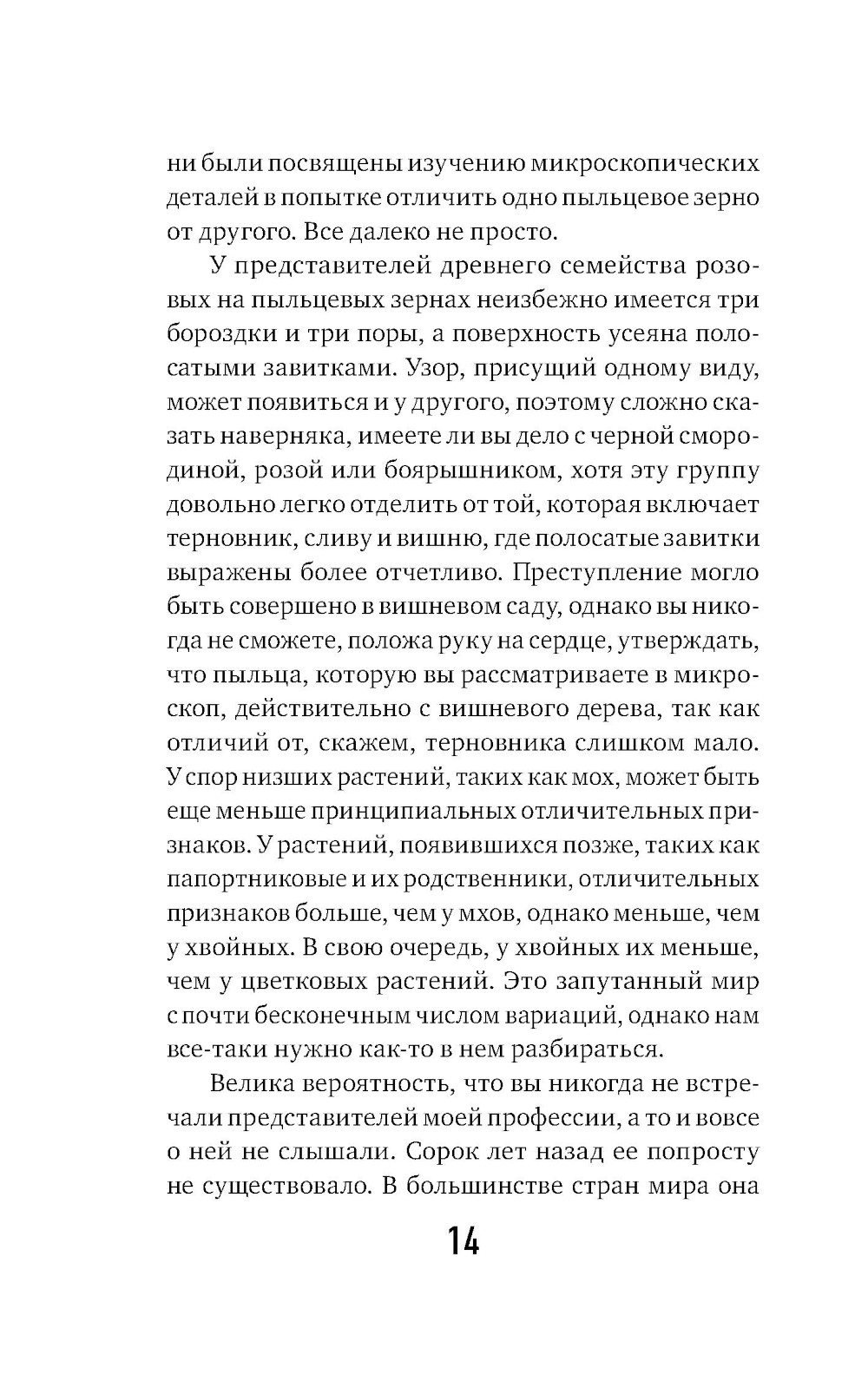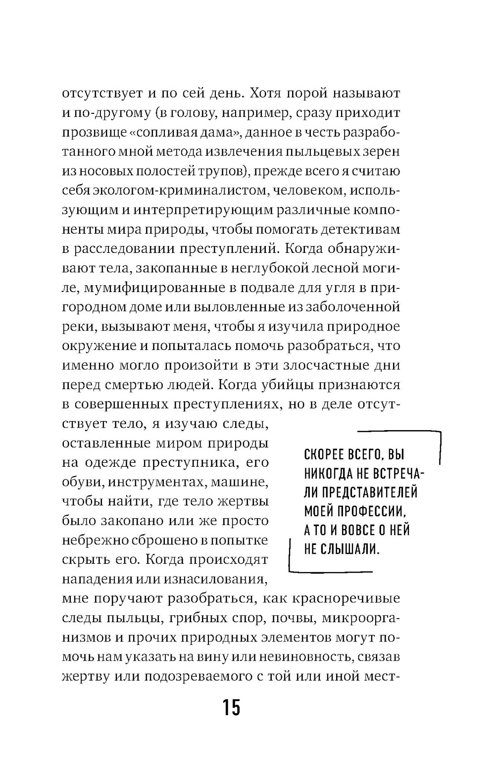 Мир окружающей природы всегда хранит следы нашего присутствия, являясь безмолвным свидетелем событий и происшествий, в том числе и самых страшных. Книга Патриции Уилтшир, первоклассного судебного эколога, проведет вас по сумрачной заболоченной пустоши в поисках спрятанного тела и даже заведет в жуткую квартирку, где пропитанные кровью ковры помогут определить время смерти жертвы. Это удивительная история университетского профессора и одного из самых востребованных в мире консультантов. Вы удивитесь, как много растения, пыль или следы на проселочной дороге могут сказать об обстоятельствах преступления человеку, чья работа - разгадывать головоломки, скрывающиеся в недрах леса и земли, в складках одежды и на ветвях деревьев.| Издательство | Эксмо |