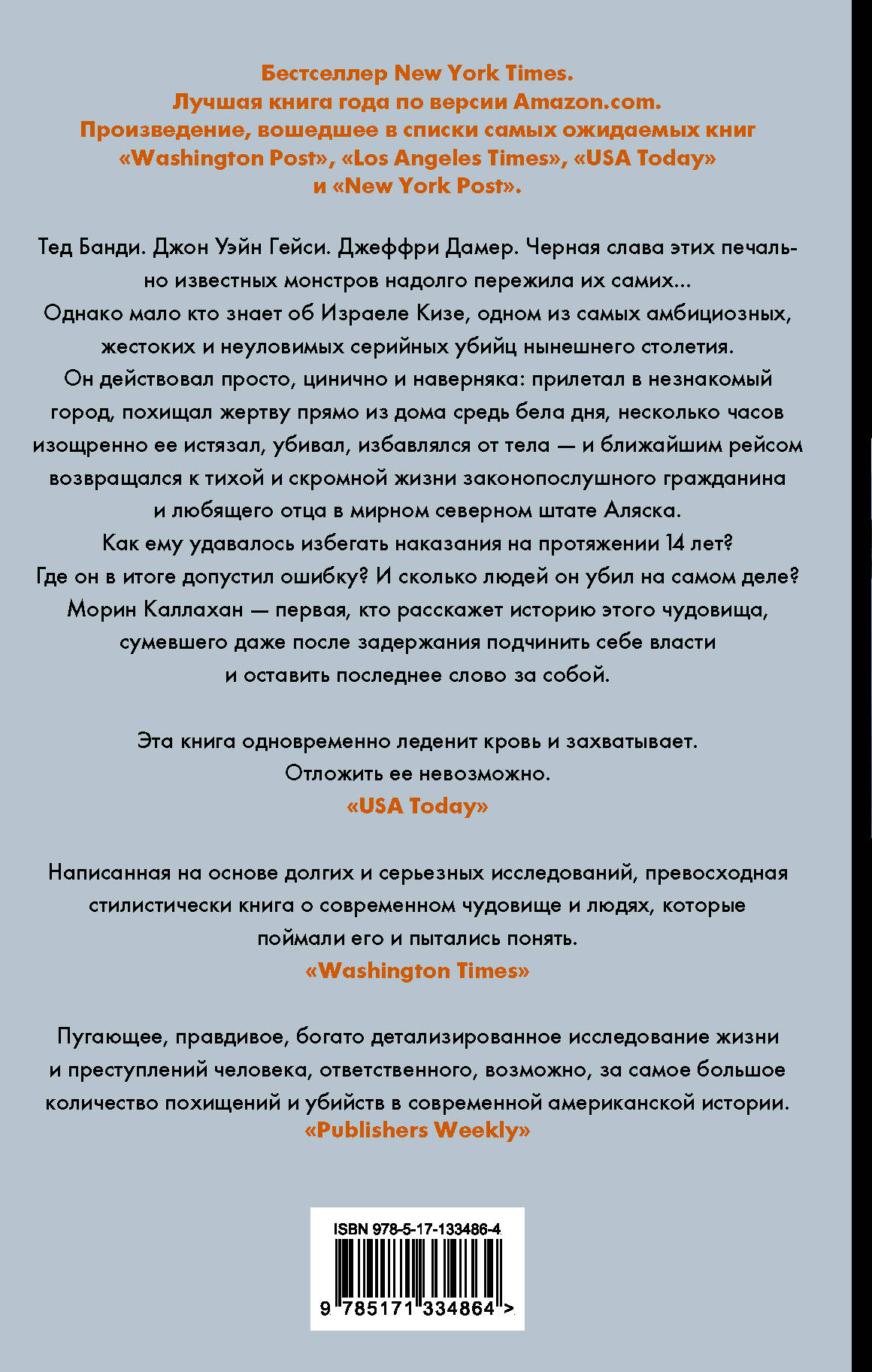 Тед Банди. Джон Уэйн Гейси. Джеффри Дамер. Черная слава этих печально известных монстров надолго пережила их самих… Однако мало кто знает об Израеле Кизе, одном из самых амбициозных, жестоких и неуловимых серийных убийц нынешнего столетия. Он действовал просто, цинично и наверняка: прилетал в незнакомый город, похищал жертву прямо из дома средь бела дня, несколько часов изощренно ее истязал, убивал, избавлялся от тела - и ближайшим рейсом возвращался к тихой и скромной жизни законопослушного гражданина и любящего отца в мирном северном штате Аляска. Как ему удавалось избегать наказания на протяжении 14 лет? Где он в итоге допустил ошибку? И сколько людей он убил на самом деле? Морин Каллахан - первая, кто расскажет историю этого чудовища, cумевшего даже после задержания подчинить себе власти и оставить последнее слово за собой.
