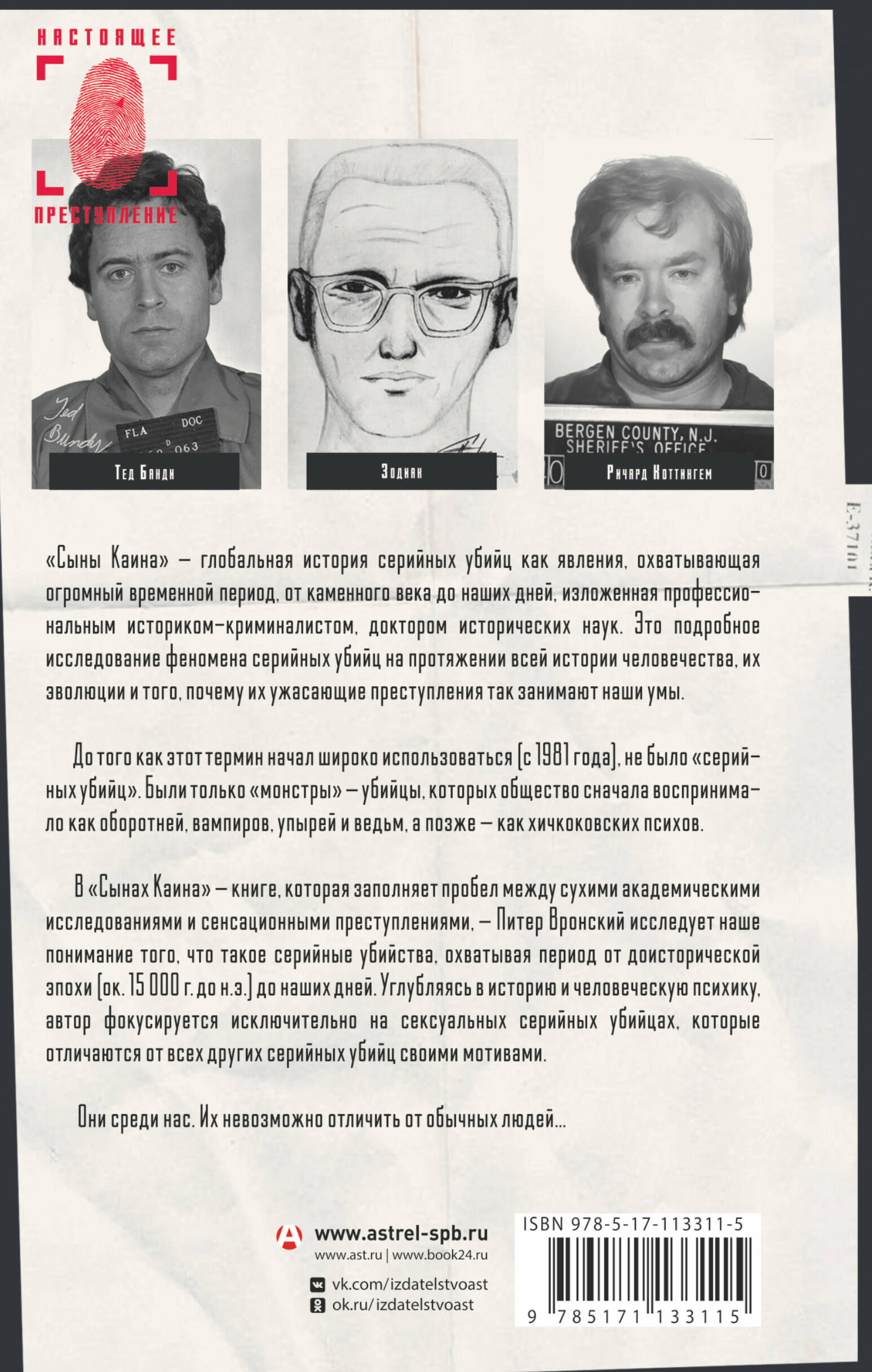 «Сыны Каина» - это полноценное исследование эволюции серийных убийц, их происхождения и мотивов от каменного века до наших дней. Питер Вронский - профессиональный историк-криминалист, автор нескольких бестселлеров о серийных убийцах. В книге представлены не только уникальные исследования, но и собраны самые шокирующие и интересные случаи в истории.| Издательство | АСТ |