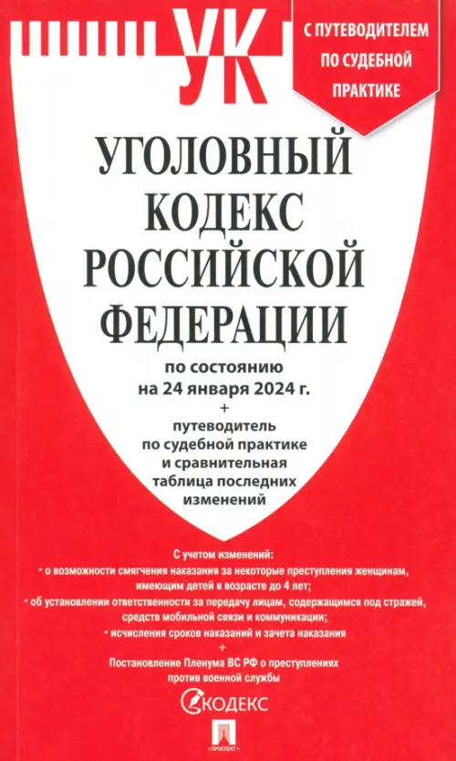 Аннотация: Уголовный кодекс РФ по состоянию на 24.01.2024 + путеводитель по судебной практике и сравнительная таблица последних изменений