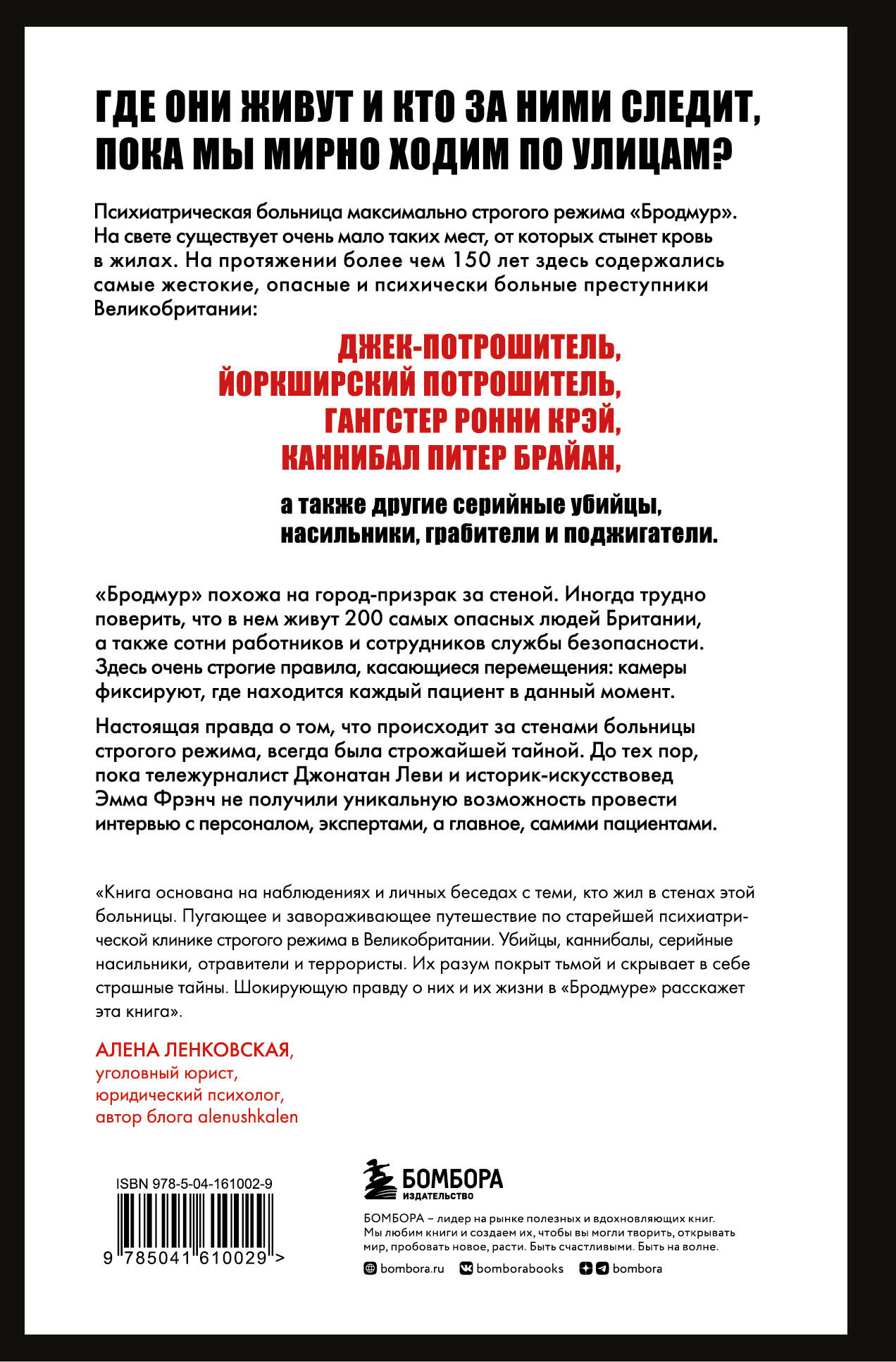 Бродмур. За фасадом старинного викторианского здания скрывается одно из самых опасных мест в Великобритании - больница строгого режима для психически больных преступников. В Бродмуре, существующем уже более 150 лет, содержатся люди, преступления которых в свое время шокировали мир своей жестокостью. Среди его печально известных обитателей были: - «Стоквеллский душитель» Кеннет Эрскин, - «Йоркширский потрошитель» Питер Сатклифф, - каннибал Питер Брайан, - предводитель лондонской банды Рорри Крэй... ...и другие серийные убийцы, грабители, насильники. Авторы этой книги, тележурналист Джонатан Леви и историк-искусствовед Эмма Френч, провели колоссальную работу с архивами Бродмура в попытках лучше узнать историю этого мрачного места. Около 10 лет они общались с его пациентами и персоналом, изучая внутреннюю жизнь больницы, окруженную огромным количеством мифов и легенд. Могут ли лучшие врачи проникнуть в темные воды сознания своих пациентов, постичь их мозг и в итоге вылечить их? По какой причине преступники, находящиеся в Бродмуре, совершали те страшные поступки, которые в итоге привели их сюда? Как складываются взаимоотношения между пациентами и медперсоналом? Это уникальная книга о больнице, больше похожей на город-призрак, ее пугающих обитателях и преданных работниках, ежедневно находящихся бок о бок с самыми опасными людьми Великобритании. «Книга основана на наблюдениях и личных беседах с теми, кто жил в стенах этой больницы. Пугающее и завораживающее путешествие по старейшей психиатрической клинике строгого режима в Великобритании. Убийцы, каннибалы, серийные насильники, отравители и террористы. Их разум покрыт тьмой и скрывает в себе страшные тайны. Шокирующую правду о них и об их жизни в "Бродмуре" расскажет эта книга». - Алена Ленковская, уголовный юрист, юридический психолог, автор блога alenushka.len