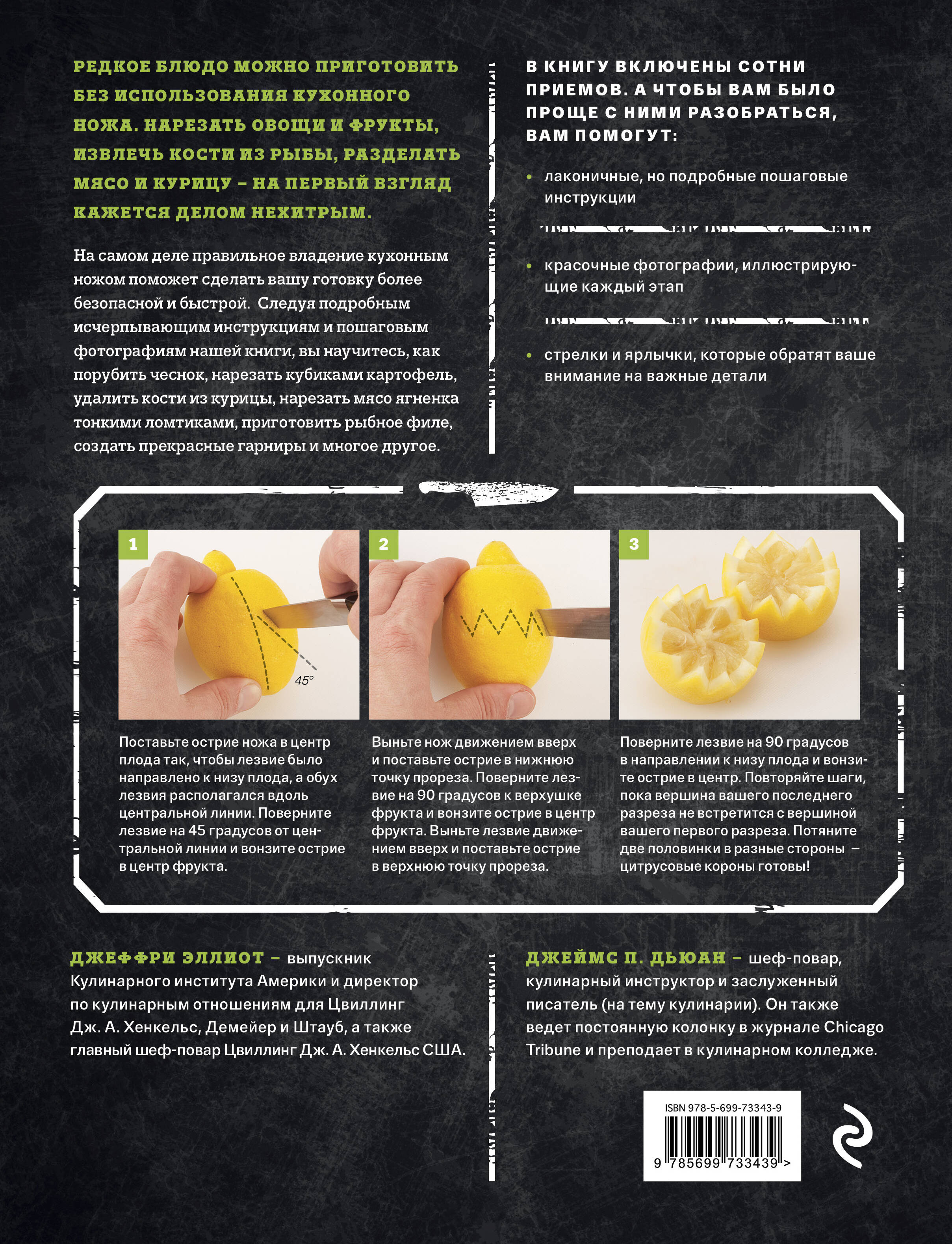 В книгу включен сотни приемов. А чтобы вам было проще с ними разобраться, вам помогут: • лаконичные, но подробные пошаговые инструкции • красочные фотографии, иллюстрирующие каждый этап • стрелки и ярлычки, которые обратят ваше внимание на важные детали ДЖЕФФРИ ЭЛЛИОТ - выпускник Кулинарного института Америки и директор по кулинарным отношениям для Цвиллинг Дж. А. Хенкельс, Демейер и Штауб, а также главный шеф-повар Цвиллинг Дж. А. Хенкельс США. ДЖЕЙМС П. ДЬЮАН - шеф-повар, кулинарный инструктор и заслуженный писатель (на тему кулинарии). Он также ведет постоянную колонку в журнале Chicago Tribune и преподает в кулинарном колледже.| Издательство | ООО "Издательство "Эксмо" |