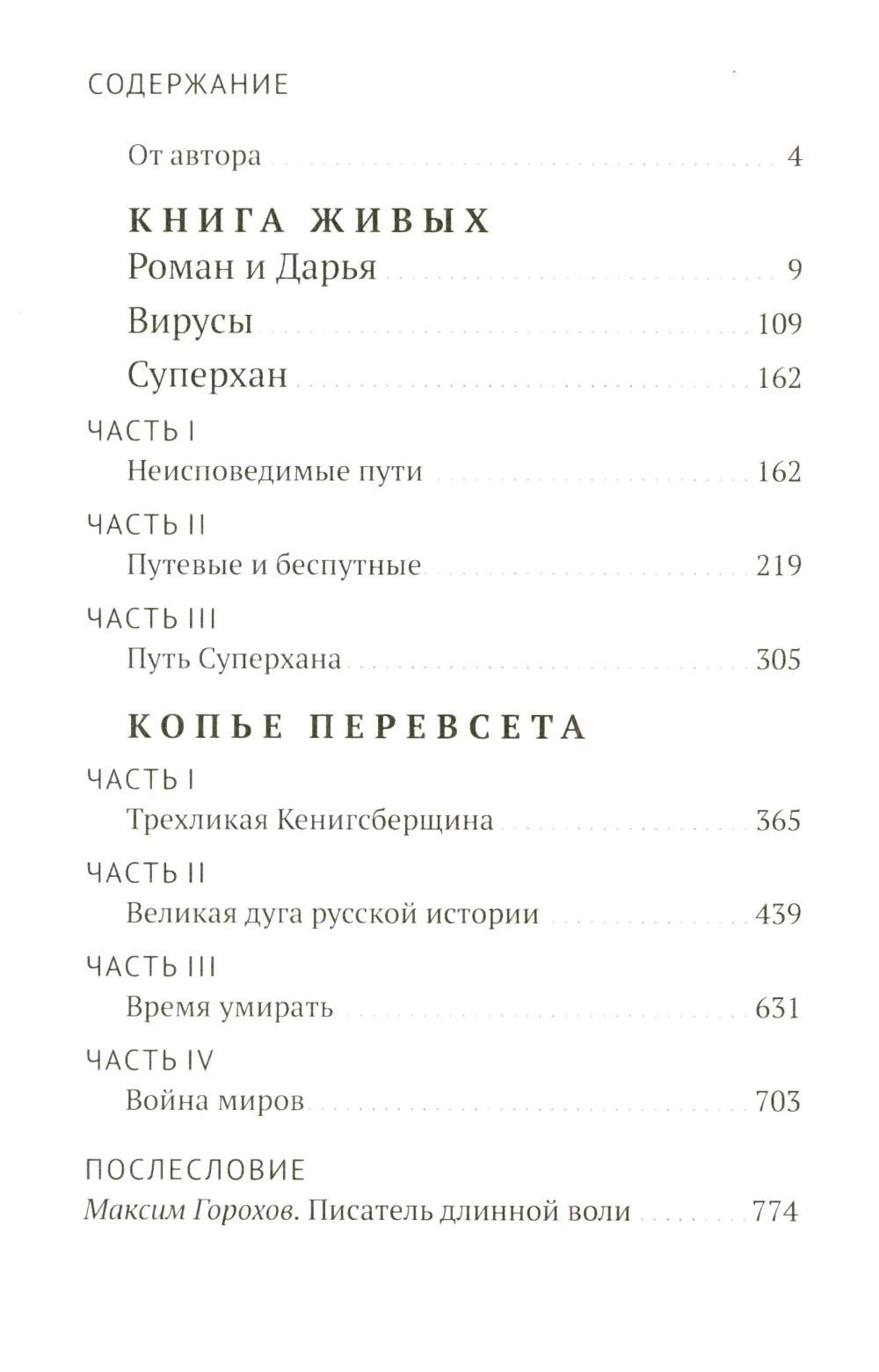 В четвертый том эпоса «Руссиада» включены трилогия «Книга живых» и роман «Копье Пересвета.» «Книгу живых» составили три очень своеобразных произведения: романтическая повесть «Роман и Дарья», политический детектив «Суперхан» и философская притча «Вирусы». Героям «Русского креста» приходится разбираться в хитросплетениях взаимоотношений человека с обществом, властью и силами природы. Роман «Копье Пересвета» - продолжение травелога «Крымский мост». Олег Мировой станет Мировым. Обретет новое имя и новый смысл в жизни. Совершит путешествие по родной стране в поисках древнего артефакта, символа праведной Победы. Валаам, Дивеева пустынь, Углич, Симбирск-Ульяновск, Куйбышев-Самара, Саров-Арзамас-16 и, наконец, героический Мариуполь - таким крутым маршрутом предстоит читателю прийти к финалу «Руссиады».| Издательство | Вече |