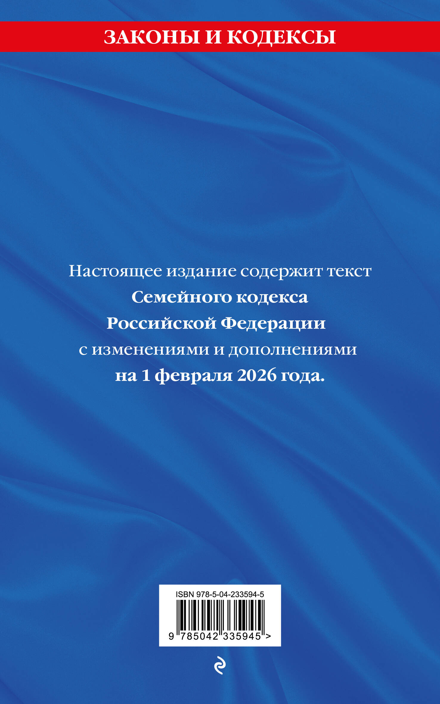 Настоящее издание содержит текст Семейного кодекса Российской Федерации с изменениями и дополнениями на 1 февраля 2026 года с удобной навигацией и таблицей изменений. Если есть изменения, вступающие в силу позднее, то вместе с редакцией нормы, действующей на эту дату, приводится норма в новой редакции и указывается дата, с которой она вступает в силу. В данной книге содержится вся актуальная информация на дату подписания издания в печать.