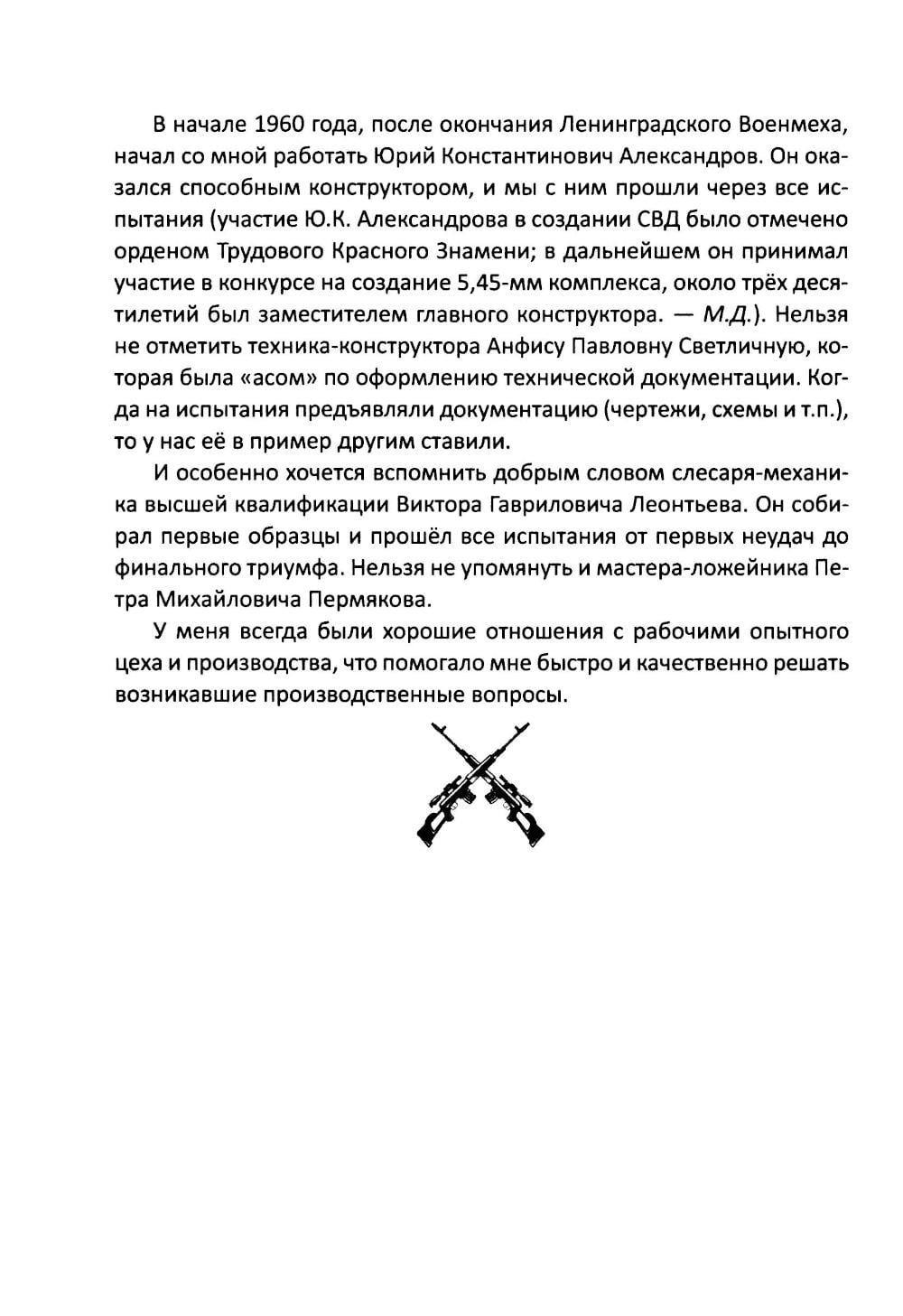 В 1958-1963 гг. руководство Министерства обороны СССР проводило конкурс на новую снайперскую винтовку для замены заслуженной, но морально устаревающей «мосинки» образца 1891/30 гг. с оптическим прицелом. Неожиданным победителем оказался самый молодой из участников - ижевец Евгени Драгунов, до тех пор занимавшийся конструированием лишь спортивного, «игрушечного» по мнению конкурентов оружия. Так на вооружение Советской Армии, а затем и на мировой оружейный рынок попала «плетка» - легендарная винтовка СВД. В этой книге читатель сможет познакомится с биографией ее конструктора Е.Ф. Драгунова (1920-1991), узнает о различных образцах оружия, созданного им до, и после СВД, о непростом пути ее победы на конкурсе и о том, какую роль в ее судьбе сыграл легендарный снайпер Василий Зайцев. Будет сказано и о ее перспективах в качестве оружия для снайпера и «марксмана» - лучшего пехотного стрелка - и какие альтернативы разрабатываются для Вооруженных Сил России в будущем.| Издательство | Родина |