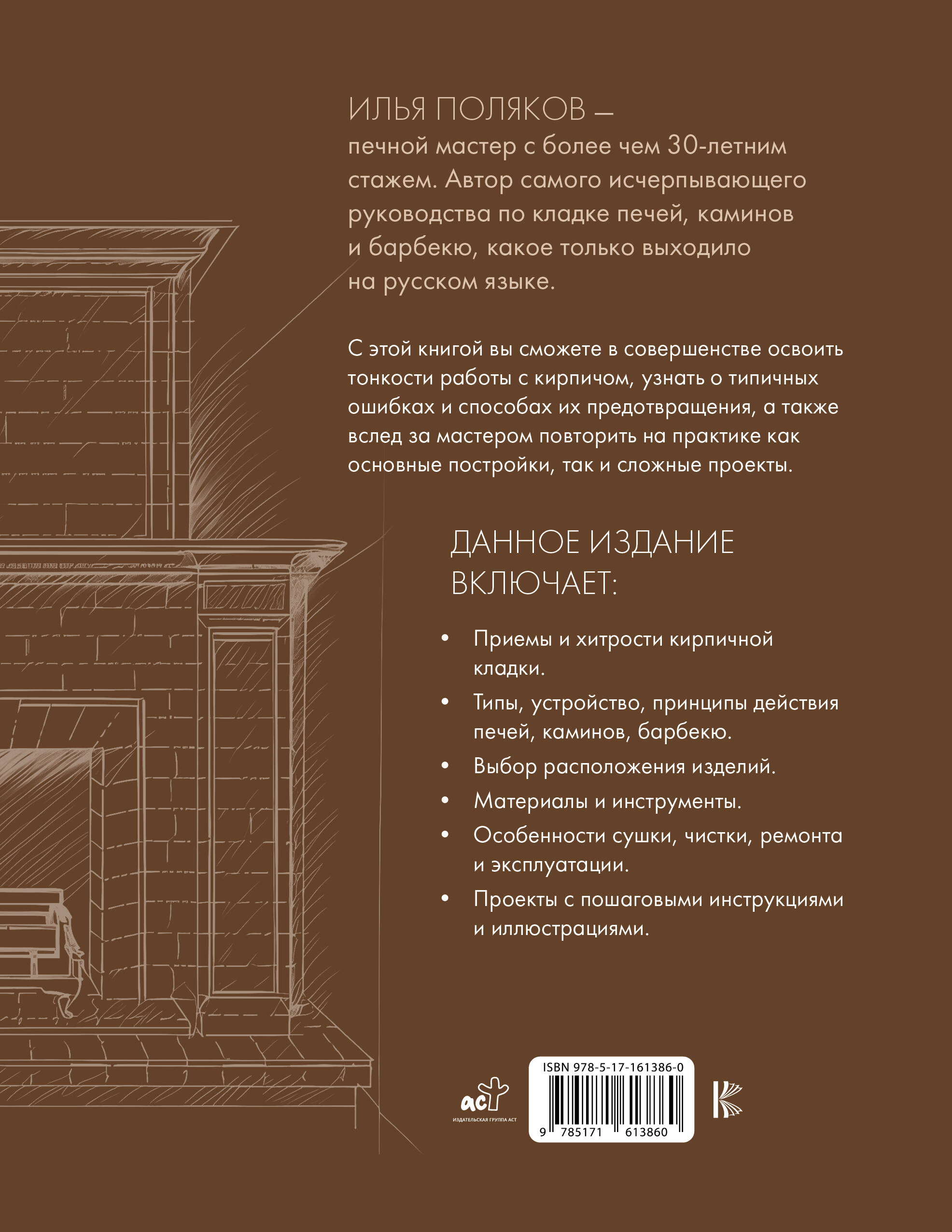 Илья Поляков - печной мастер с более чем 30-летним стажем. Автор самого исчерпывающего руководства по кладке печей, каминов и барбекю, какое только выходило на русском языке. С этой книгой вы сможете в совершенстве освоить тонкости работы с кирпичом, узнать о типичных ошибках и способах их предотвращения, а также вслед за мастером повторить на практике как основные постройки, так и сложные проекты. Данное издание включает: • Приемы и хитрости кирпичной кладки. • Типы, устройство, принципы действия печей, каминов, барбекю. • Выбор расположения изделия. • Материалы и инструменты. • Особенности сушки, чистки, ремонта и эксплуатации. • Проекты с пошаговыми инструкциями и иллюстрациями.| Издательство | Издательство "АСТ" |