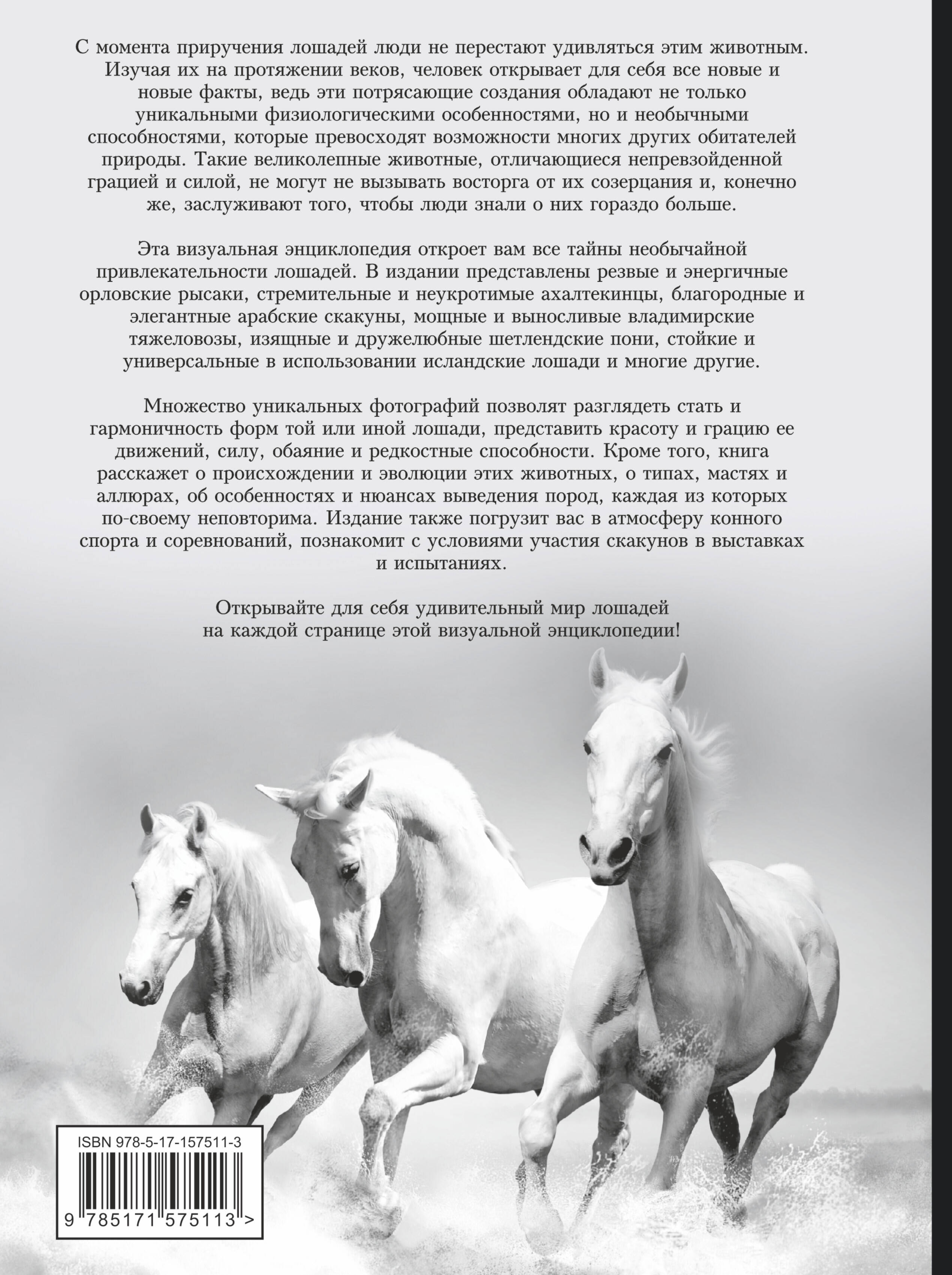 В этой иллюстрированной энциклопедии собраны все самые интересные факты и зрелищные фотографии, посвященные сильным и красивым, стремительным и неукротимым, благородным и элегантным животным - лошадям. Вы сможете познакомиться с историей их происхождения и эволюцией, разнообразием пород и разновидностей, узнать о конном спорте и скачках. Вас ждет не только увлекательное чтение, но и визуальное погружение в мир этих прекрасных существ. Каждая страница книги буквально оживает благодаря красочным и живописным изображениям, на которых запечатлены волшебные моменты скачек, блестящие выступления на конных соревнованиях, гармоничное взаимодействие с людьми, спокойные пастбища и вольные просторы, где животные обретают свободу и особенную привлекательность. Данная энциклопедия станет незаменимым справочником для всех любителей лошадей, будь то профессионалы в этой области или просто увлеченные энтузиасты. Вы не только расширите свои знания об этих животных, но и оцените грацию, ум и преданность удивительных созданий, которые на протяжении тысячелетий остаются верными спутниками и помощниками человека. Удивительное разнообразие и красота мира лошадей ждут вас на каждой странице этой визуальной энциклопедии с потрясающими иллюстрациями!
