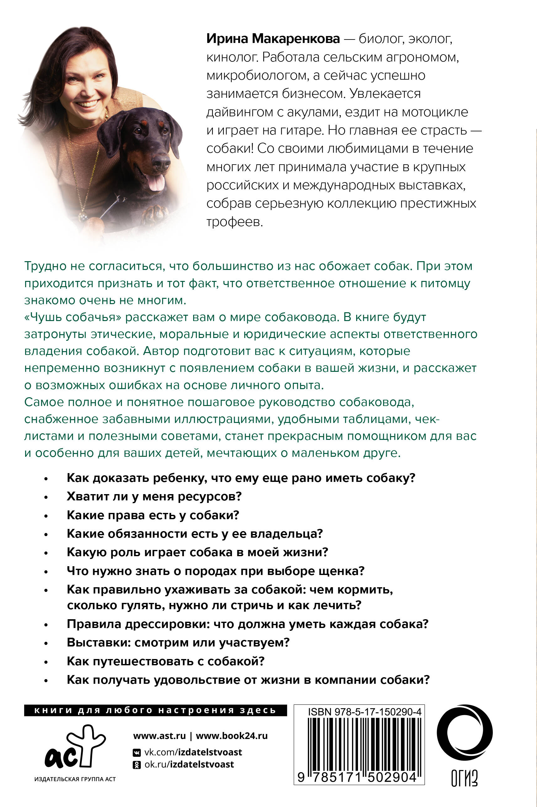 Появление в доме собаки - это не только большая радость, но и большая ответственность. Как подготовиться к появлению питомца с умом, позаботиться о его здоровье и благополучии, наслаждаться общением с ним, не испытывая негатива от его шалостей? В книге «Чушь собачья. Как не испортить удовольствие от появления собаки в твоей жизни» автор подробно разбирает различные вопросы, с которыми могут столкнуться владельцы собаки: выбор породы, кормление и уход, дрессировка и игры, профилактика заболеваний, путешествия с любимцем. Книга написана легко и с юмором, дополнена забавными рисунками и включает обилие полезных материалов - QR-коды на видео-уроки, чек-листы, таблицы, задания для самопроверки и дополнительная литература. Вы узнаете всё о воспитании собак - от А до Я!| Издательство | Издательство "АСТ" |