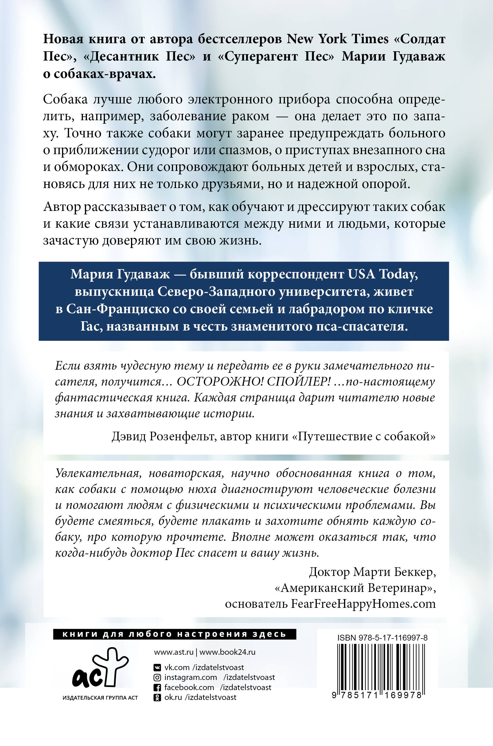 Новая книга от автора бестселлеров New York Times "Солдат Пес", "Десантник Пес" и "Суперагент Пес" Марии Гудаваж о собаках-врачах. Собака лучше любого электронного прибора способна определить, например, заболевание раком - она делает это по запаху. Точно также собаки могут заранее предупреждать больного о приближении судорог или спазмов, о приступах внезапного сна и обмороках. Они сопровождают больных детей и взрослых, становясь для них не только друзьями, но и надежной опорой. Автор рассказывает о том, как обучают и дрессируют таких собак и какие связи устанавливаются между ними и людьми, которые зачастую доверяют им свою жизнь.