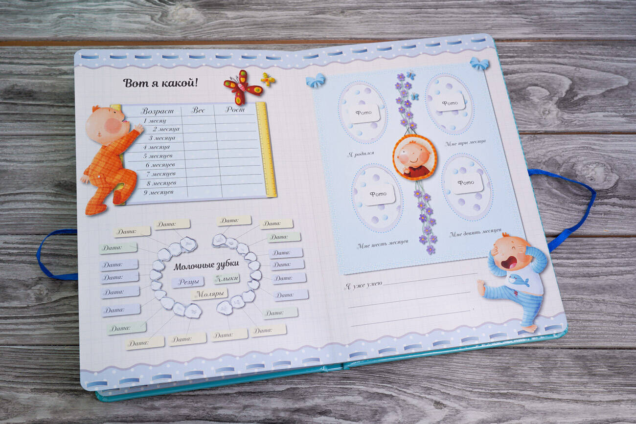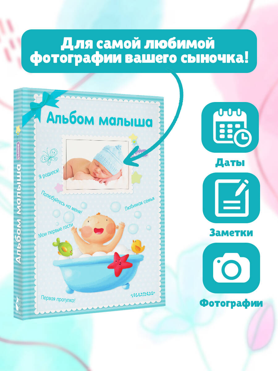 Какой самый главный день в жизни? Конечно же, рождение вашего самого красивого сыночка в мире! С первых дней он будет вас любить всем сердцем и дарить вам первую улыбку, первое "агу", первые шажочки и первое, самое заветное слово - "мама". Эти трогательные моменты навсегда останутся в вашем сердце, а чтобы и ваш малыш смог потом посмотреть на себя маленького, запишите в этот альбом первые достижения крохи и вставьте фотографии вашего принца между плотными страничками. А самую лучшую фотографию можно вставить в саму обложку, и у вас получится уникальная книга вашего сыночка! Счастья вам и вашему малышу!| Издательство | Издательство "АСТ" |