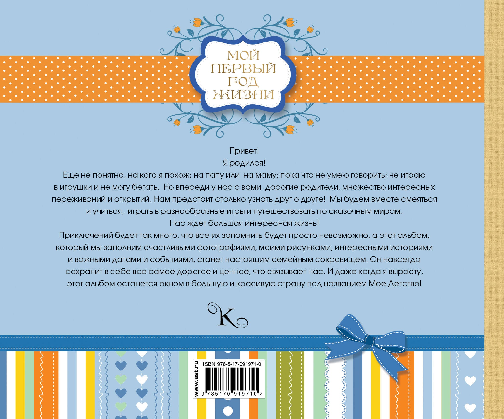 Альбом "Мой первый год жизни" станет идеальным подарком молодым родителям, в котором они смогут сохранить самые дорогие моменты самого первого года жизни своего ребенка. Мальчик это будет, девочка, близнецы или двойняшки - яркий, красочный альбом подойдет для хранения любых ваших воспоминаний! Снимок УЗИ, отпечаток ладошки, первые рисунки и первые слова - ничего не потеряется, благодаря оригинальной конструкции с кармашками. И когда ваш ребенок вырастет, вы передадите ему этот уникальный альбом, а вместе с ним вашу любовь и заботу!| Издательство | ИЗДАТЕЛЬСТВО "АСТ" |