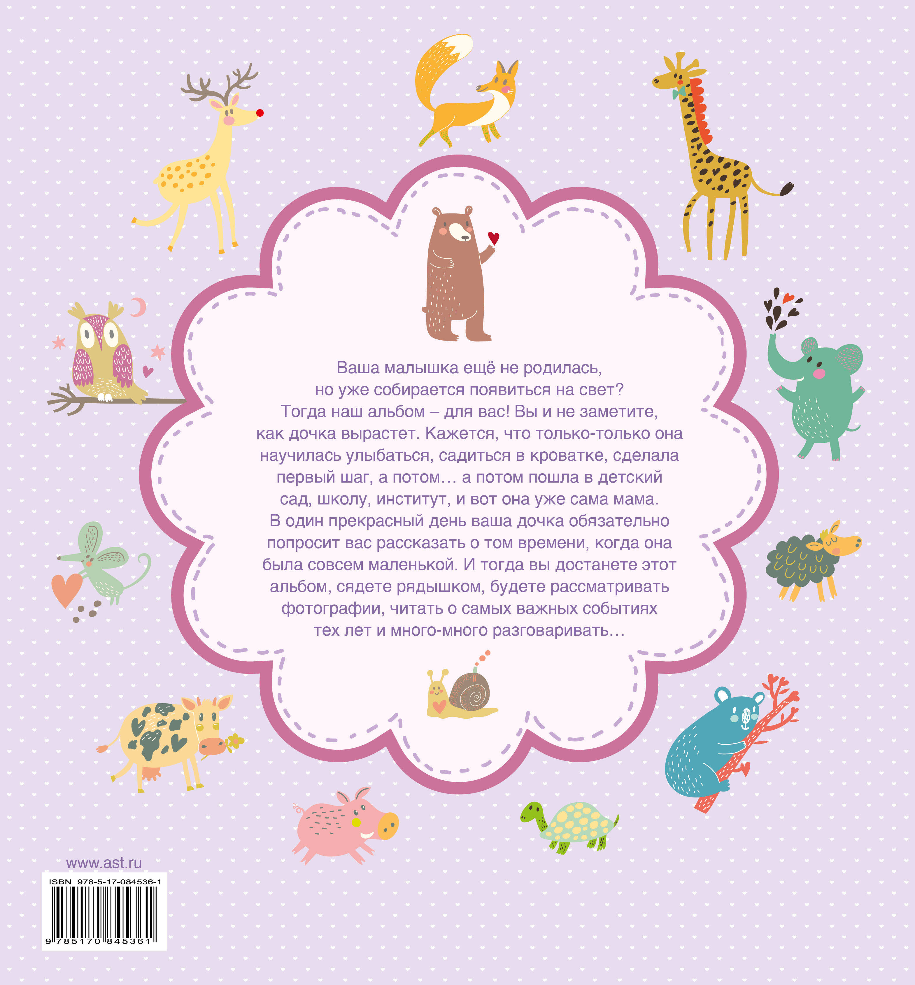 Интерактивное издание, предназначенное для запоминания самых важных событий первых трёх лет ребёнка: вклеиваем фотографии малыша, помещаем в специальные конвертики прядку волос и бирочку из роддома и конечно записываем самые яркие моменты! Также наш альбом содержит колыбельные песенки и сказки, которые наверняка понравятся вашему малышу!| Издательство | Издательство "АСТ" |