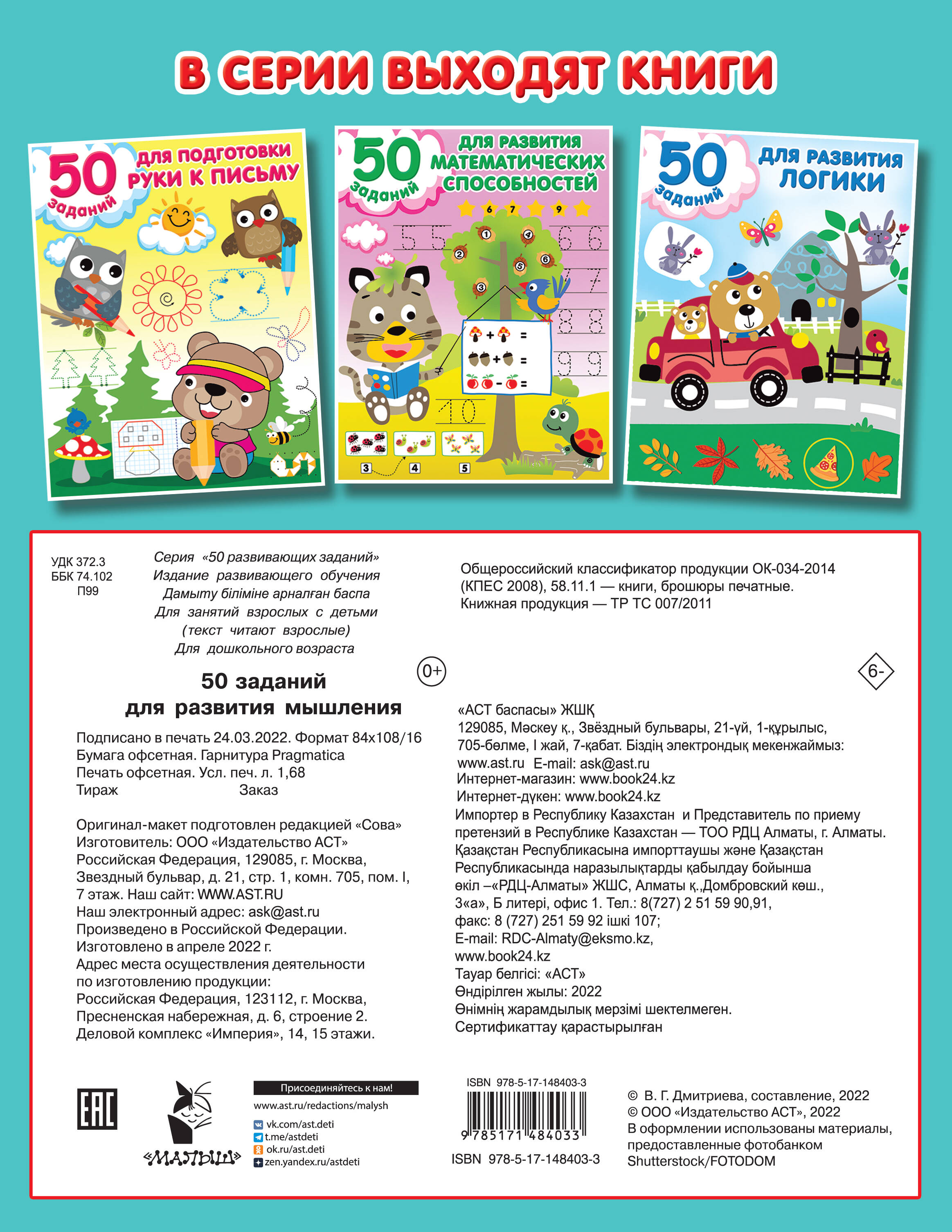 «50 заданий для развития мышления» - это сборник занимательных упражнений для малышей. Игры и упражнения с картинками развивают образное, логическое, творческое мышление и интеллект. Выполняя представленные в книге задания, малыш постепенно будет учиться мыслить, сопоставлять, делать выводы.