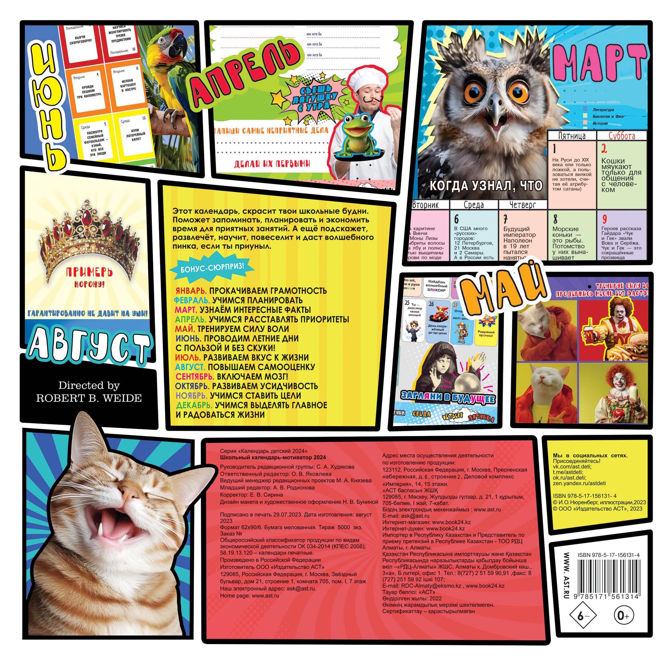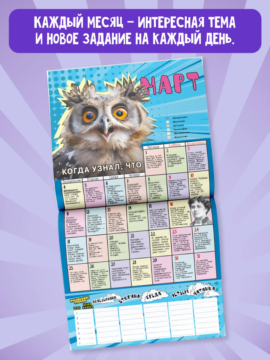 Троянский конь среди мотивирующих изданий для детей. Протаскивает полезные навыки в мир школьника без занудства и нравоучений. Под толстым слоем популярных мемов и забавных мотиваторов в календаре спрятаны: to do list для фиксации важных дел, полезные лайфхаки, развивающие задания, познавательные факты, правила орфографии, творческие челленджи. Каждый месяц - интересная тема и новое задание на каждый день. Календарь мотивирует детей к достижениям в учёбе и творчестве и учит планированию учёбы и досуга, самомотивации, выделению и формулировке основных фактов. По завершению года календарь становится памятным альбомом успехов.| Издательство | ИЗДАТЕЛЬСТВО "АСТ" |