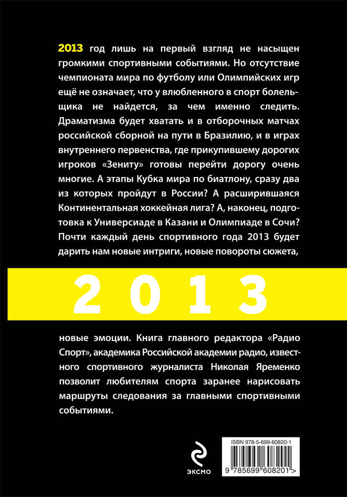 2013 год лишь на первый взгляд не насыщен громкими спортивными событиями. Но отсутствие чемпионата мира по футболу или Олимпийских игр ещё не означает, что у влюблённого в спорт болельщика не найдётся, за чем именно следить. Драматизма будет хватать и в отборочных матчах российской сборной на пути в Бразилию, и в играх внутреннего первенства, где прикупившему дорогих игроков "Зениту" готовы перейти дорогу очень многие. А этапы Кубка мира по биатлону, сразу два из которых пройдут в России? А расширившаяся Континентальная хоккейная лига? А, наконец, подготовка к Универсиаде в Казани и Олимпиаде в Сочи? Почти каждый день спортивного года-2013 будет дарить нам новые интриги, новые повороты сюжета, новые эмоции. Книга главного редактора "Радио Спорт", академика Российской Академии Радио, известного спортивного журналиста Николая Яременко позволит любителям спорта заранее нарисовать маршруты следования за главными спортивными событиями.