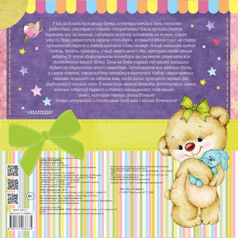 У вас родилась красавица-дочка, и теперь каждый день наполнен радостью, счастьем и новыми открытиями! Ваша крошка учится держать вас за пальчик, садиться на попку, встаёт на ножки, и вот уже по дому разносится первое "топ-топ", а самый родной голос на свете произносит первое и такое ласковое слово "мама". А ещё малышке нужно гулять, делать прививки, и ещё много-много дел, которые никак нельзя забыть! В этом удивительном календаре вы сможете отмечать все достижения вашей дочки. День за днём первый год вашей малышки будет на страничках этого календаря. Записывайте все важные даты, а самое главное, наклеивайте наклейки в клеточки! Набор самых нужных наклеек позволит не забыть вам, когда ваша принцесса первый раз улыбнулась и сказала "агу". В календарь можно вклеить фотографии самых важных событий первого и такого насыщенного года вашей семьи, которая теперь стала больше! Новых открытий и счастливых дней вам с вашей доченькой!| Издательство | Издательство "АСТ" |