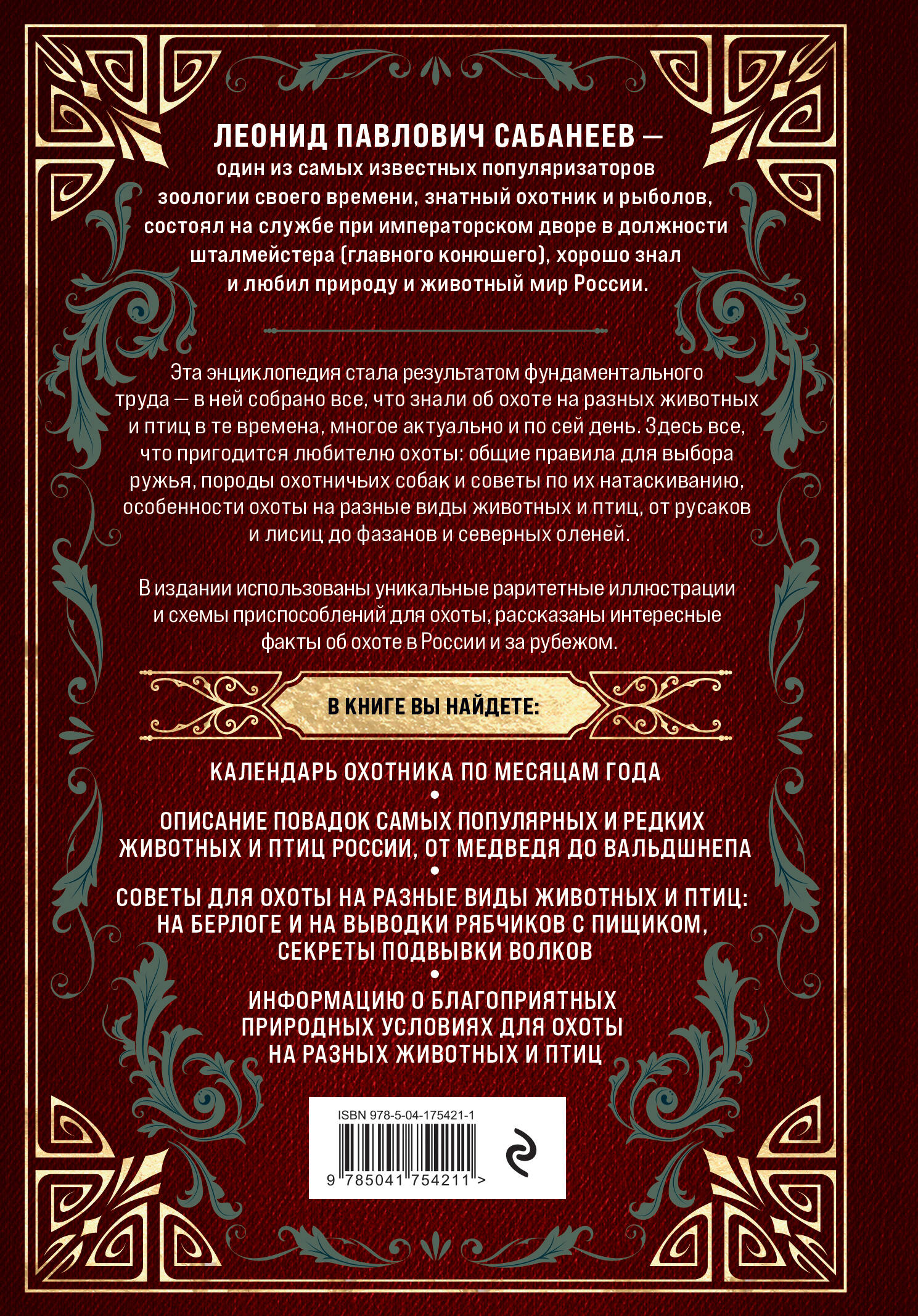 Леонид Павлович Сабанеев - один из самых известных популяризаторов зоологии своего времени, знатный охотник и рыболов, состоял на службе при Императорском дворе в должности шталмейстера (главного конюшего), хорошо знал и любил природу и животный мир России. Эта энциклопедия стала результатом фундаментального труда - в ней собрано все, что знали об охоте на разных животных и птиц в те времена, многое актуально и по сей день. Здесь все, что пригодится любителю охоты: общие правила для выбора ружья, породы охотничьих собак и советы по их натаскиванию, особенности охоты на разные виды животных и птиц, от русаков и лисиц до фазанов и северных оленей. В издании использованы уникальные раритетные иллюстрации и схемы приспособлений для охоты, рассказаны интересные факты об охоте в России и за рубежом. В книге вы найдете: • календарь охотника по месяцам года; • описание повадок самых популярных и редких животных и птиц России от медведя до вальдшнепа; • советы для охоты на разные виды животных и птиц: на берлоге и на выводки рябчиков с пищиком, секреты подвывки волков; • информацию о благоприятных природных условиях для охоты на разных животных и птиц.| Издательство | ООО "Издательство "Эксмо" |