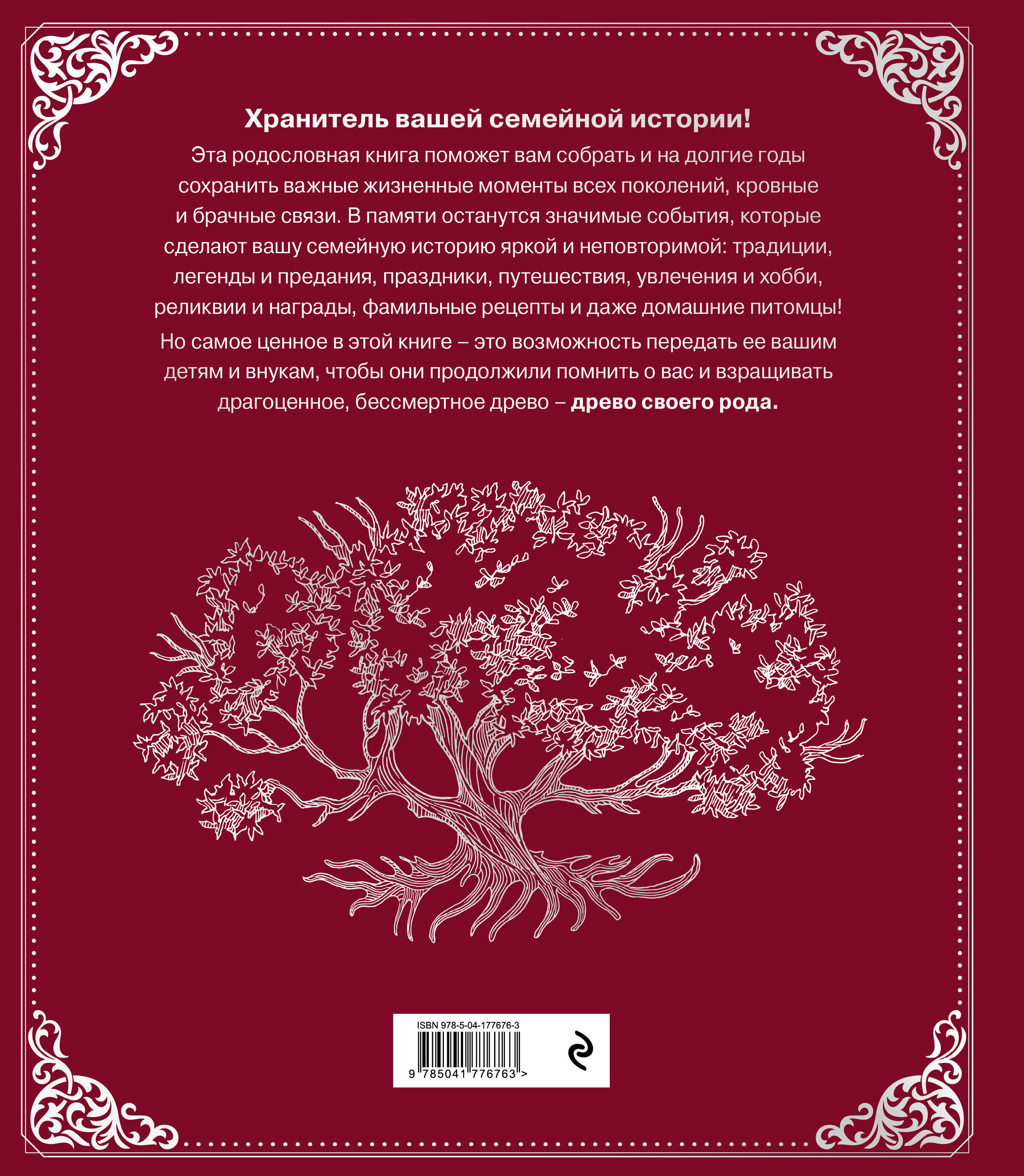 Перед вами - родословная книга, которая может стать настоящей реликвией вашей семьи. Из тех, которые хранят десятилетиями, а то и веками, с особенным волнением и уважением. Эта книга поможет вам собрать воедино и систематизировать историю вашей семьи. Она надежно сохранит информацию о родоначальнике и истоках вашего рода, важных жизненных вехах его представителей, сведения о занятиях и образе жизни поколений, бесценные фотографии. Останутся в памяти и другие вещи, которые сделают вашу семейную историю яркой и неповторимой: традиции, легенды и предания, праздники, путешествия, увлечения и хобби, реликвии и награды, фамильные рецепты и даже домашние питомцы. Но самое ценное в этой книге - это возможность передать ее своим детям и внукам, чтобы они продолжили взращивать драгоценное, бессмертное древо своего рода.| Издательство | ООО "Издательство "Эксмо" |