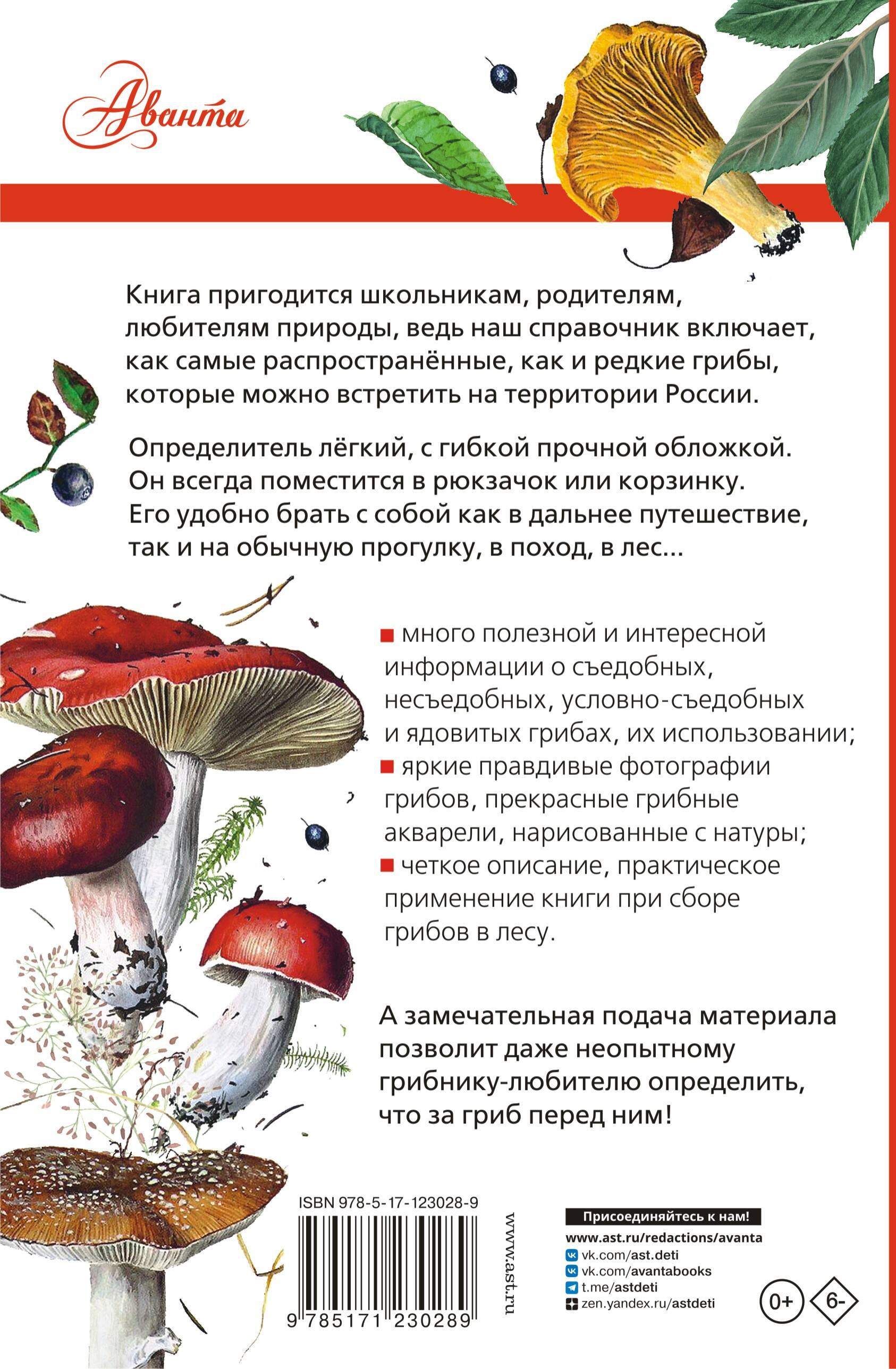 Книга пригодится школьникам, родителям, любителям природы, ведь наш справочник включает, как самые распространённые, как и редкие грибы, которые можно встретить в России. - много полезной и интересной информации о сьедобных, ядовитых грибах, их использовании; - яркие и правдивые фотографии грибов, прекрасные грибные акварели, нарисованные с натуры; - четкое описание грибов, практическое применение книги при сборе грибов в лесу. Определитель лёгкий, с гибкой прочной обложкой. Он всегда поместится в рюкзачок или корзинку. Его удобно брать с собой как в дальнее путешествие, так и на обычную прогулку, в поход, в лес... А замечательная подача материала позволит даже неопытному любителю природы определить, что за гриб перед ним!| Издательство | ИЗДАТЕЛЬСТВО "АСТ" |