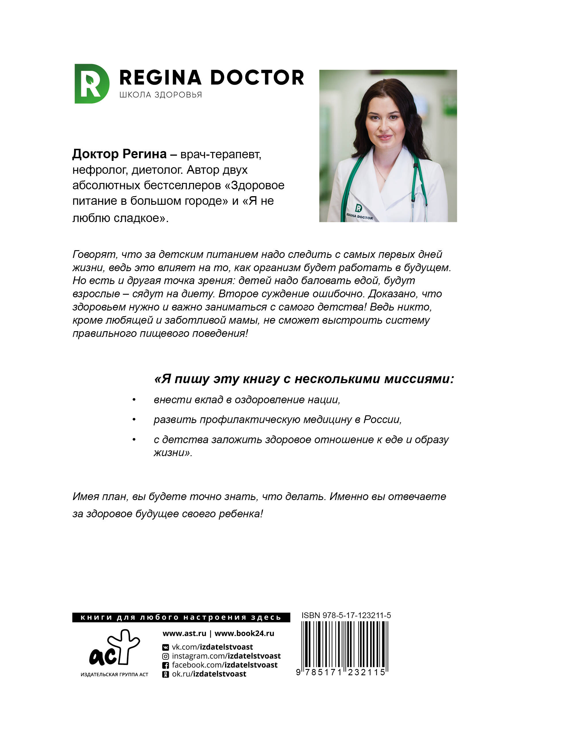 Доктор Регина - врач-терапевт, нефролог, диетолог. Автор двух абсолютных бестселлеров "Здоровое питание в большом городе" и "Я не люблю сладкое". Говорят, что за детским питанием надо следить с самых первых дней жизни, ведь это влияет на то, как организм будет работать в будущем. Но есть и другая точка зрения: детей надо баловать едой, будут взрослые - сядут на диету. Второе суждение ошибочно. Доказано, что здоровьем нужно и важно заниматься с самого детства! Ведь никто, кроме любящей и заботливой мамы, не сможет выстроить систему правильного пищевого поведения! "Я пишу эту книгу с несколькими миссиями: • внести вклад в оздоровление нации, • развить профилактическую медицину в России, • с детства заложить здоровое отношение к еде и образу жизни". Имея план, вы будете точно знать, что делать. Именно вы отвечаете за здоровое будущее своего ребенка!| Издательство | ИЗДАТЕЛЬСТВО "АСТ" |