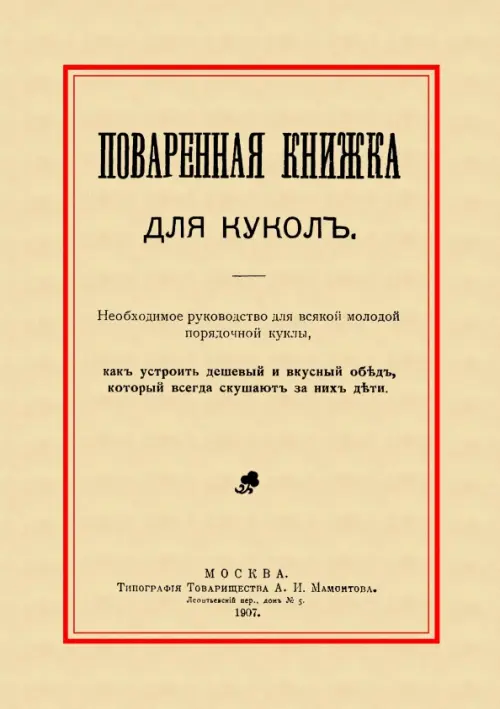 Репринт с издания. Москва, тип. т-ва А. И. Мамонтова, 1907. Необходимое руководство для всякой молодой порядочной куклы, как устроить простой и вкусный обед, который всегда скушают за них дети. (Великолепная методика заставит плохо едящих детей кушать без уговоров). Тираж 30 экз. выполнен по технологии print-on-demand.