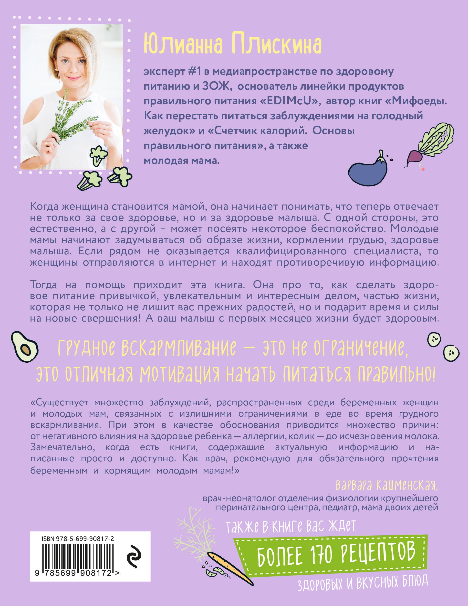 Об авторе Юлианна Плискина - эксперт #1 в медиа-пространстве по здоровому питанию и ЗОЖ, основатель линейки продуктов правильного питания «EDIMcU», автор книг «Мифоеды. Как перестать питаться заблуждениями на голодный желудок» и «Счетчик калорий. Основы правильного питания», а также молодая мама. О чем книга Все, что молодая мама должна знать о правильном питании в период лактации, плюс 170 рецептов вкусных и полезных блюд, перекусов и напитков. Особенности книги Влияние еды на состав молока. Мифы о питании в период грудного вскармливания. 20 правил здорового рациона. Формулы расчета суточной потребности в калориях и жидкости. Продуктовая корзина в период грудного вскармливания. Все об аллергенах и запрещенных продуктах. Меню первых недель после родов. Гипоаллергенная диета. Профилактика пищевой аллергии у детей раннего возраста. Правильное введение новых продуктов в свой рацион. Хранение еды и ее здоровая термическая обработка. Рецепты Гарниры. Горячие закуски. Десерты и выпечка. Домашний хлеб. Завтраки. Полезные напитки. Основные блюда. Пицца. Рецепты для праздничного стола. Салаты. Супы. Холодные закуски. Паштеты и пасты. Сэндвичи.| Издательство | ООО "Издательство "Эксмо" |
