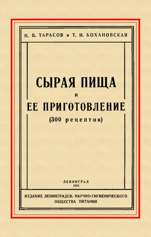 Репринт с издания. Л. 1931. Уникальная книга, написанная советскими врачами Тарасовым и Бохановской, посвящена практике и опыту сыроедения. Книга включает в себя. исторический обзор сыроедения, очерки о его идейных вдохновителях, подробный обзор сыроедения как образа жизни с точки зрения врачебной науки, а также сборник 300 рецептов блюд из сырых продуктов. Тираж 30 экз.