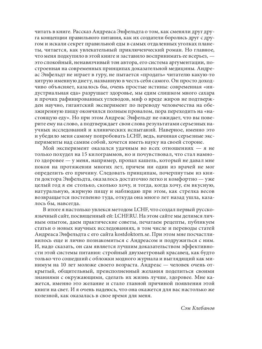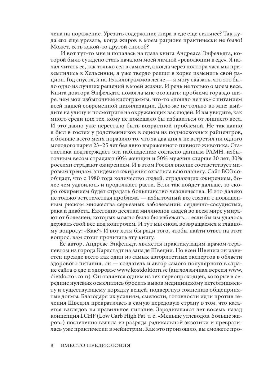 «От жиров жиреют, от белков холестерин!» - долгое время уверяли нас врачи и диетологи, призывая есть «легкую» пищу. Мы так и делали, заменяя белки и насыщенные жиры углеводами. Каковы же последствия? Сладкие напитки, чипсы, обезжиренные продукты, напичканные стабилизаторами и консервантами, в последние двадцать-тридцать лет привычно вошли в наш рацион - и мир захлестнула эпидемия ожирения. В России ожирением страдают 30% населения, а лишние килограммы - почти у каждого второго. Что же впереди? Одышка, диабет, инфаркты и инсульты? Стоп, хватит объедаться! LCHF - уникальная низкоуглеводная диета, которая позволит вам начать новую жизнь. Ешьте без ограничений масло, мясо и рыбу и наблюдайте, как с каждой неделей стрелка весов неудержимо ползет вниз, а ваша фигура обретает стройность. Фантастика? Нет, это диета по системе доктора Энфельдта - и у нее уже немало сторонников, проверивших ее на личном опыте. Прочтите книгу, оцените все преимущества новой системы похудения, подумайте, скольким людям уже помогла эта диета, и, быть может, вам захочется произвести личную «революцию в еде» и начать путь к здоровой полноценной жизни. С диетой LCHF - это не только нетрудно, но и приятно!| Издательство | Рипол Классик |