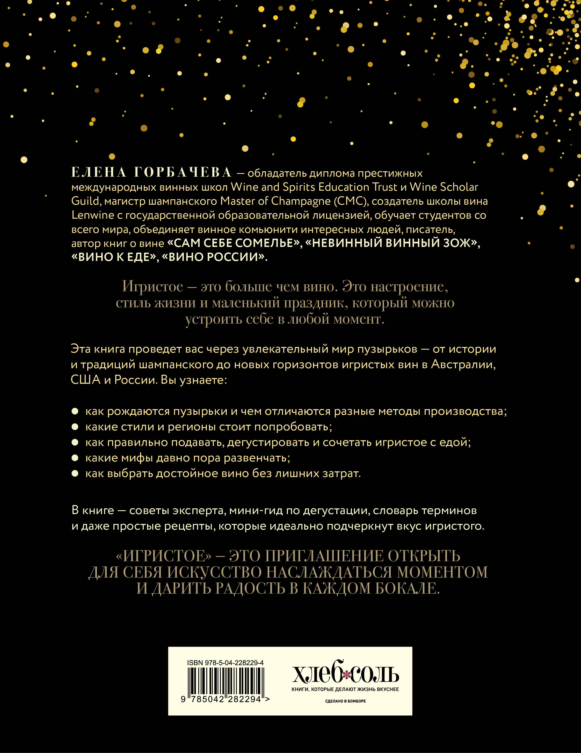 Игристое - это больше, чем вино. Это настроение, стиль жизни и маленький праздник, который можно устроить себе в любой момент. Эта книга проведёт вас через увлекательный мир пузырьков - от истории и традиций шампанского до новых горизонтов игристых вин в Австралии, США и России. Вы узнаете: • как рождаются пузырьки и чем отличаются разные методы производства; • какие стили и регионы стоит попробовать; • как правильно подавать, дегустировать и сочетать игристое с едой; • какие мифы давно пора развенчать; • как выбрать достойное вино без лишних затрат. В книге - советы эксперта, мини-гид по дегустации, словарь терминов и даже простые рецепты, которые идеально подчеркнут вкус игристого. Автор - Елена Горбачева, винный эксперт, магистр Шампанского Master of Champagne (CMС), обладатель диплома Master Level по Шампани, обладатель дипломов престижных международных винных школ Wine and Spirits Education Trust и Wine Scholar Guild, создатель школы вина Lenwine c государственной образовательной лицензией. Она пишет о сложном просто и увлекательно, превращая чтение в настоящую дегустацию.| Издательство | ООО "Издательство "Эксмо" |