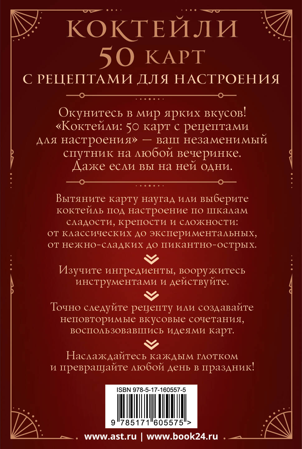 Окунитесь в мир ярких вкусов! "Коктейли: 50 рецептов для настроения" - ваш незаменимый спутник на любой вечеринке. Даже если вы на ней одни. 1. Вытяните карту наугад или выберите коктейль под настроение по шкалам сладости, крепости и сложности: от классических до экспериментальных, от нежно-сладких до пикантно-острых. 2. Изучите ингредиенты, вооружитесь инструментами и действуйте. 3. Точно следуйте рецепту или создавайте неповторимые вкусовые сочетания, воспользовавшись идеями карт. 4. Наслаждайтесь каждым глотком и превращайте любой день в праздник!| Издательство | Издательство "АСТ" |