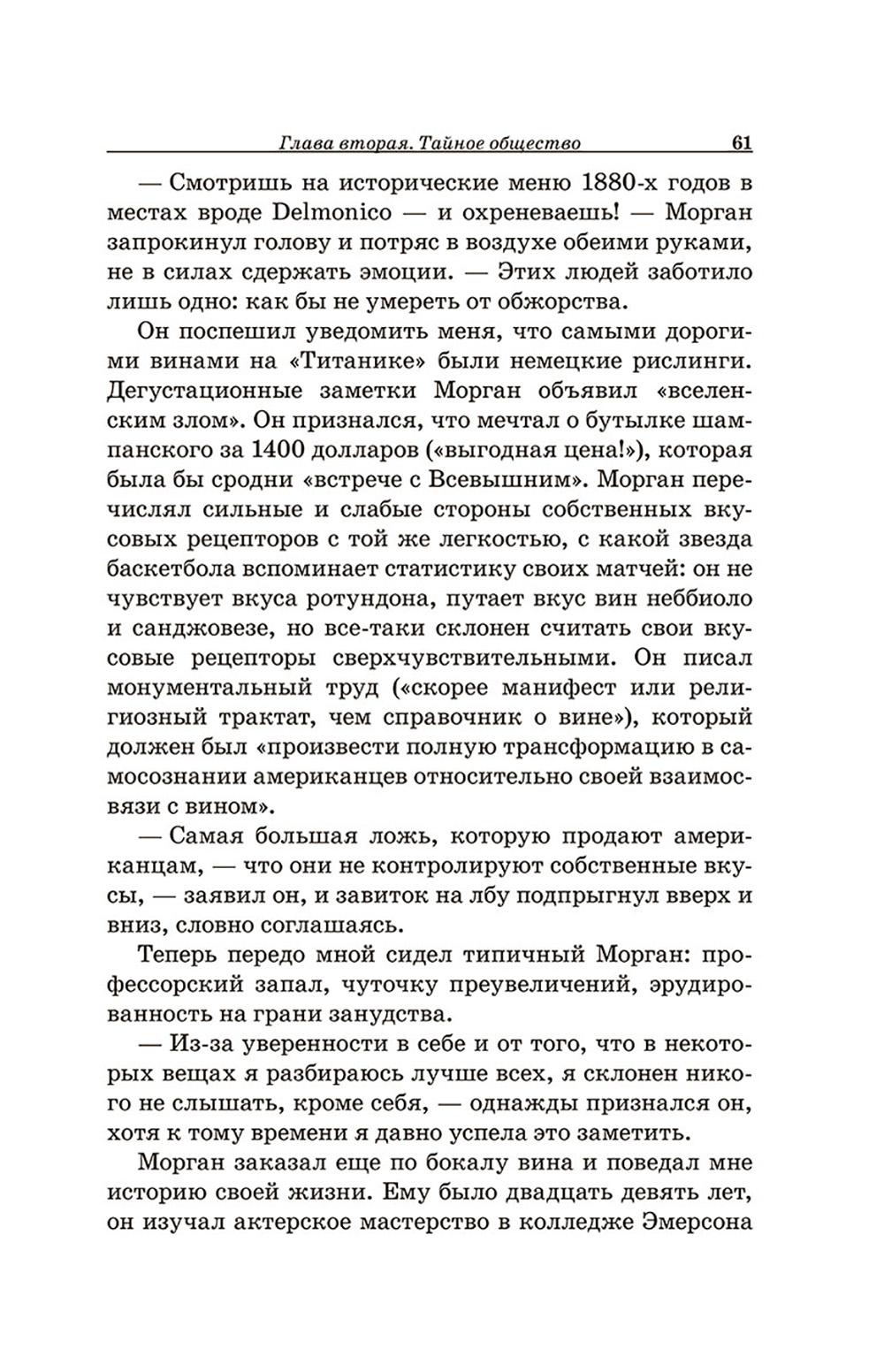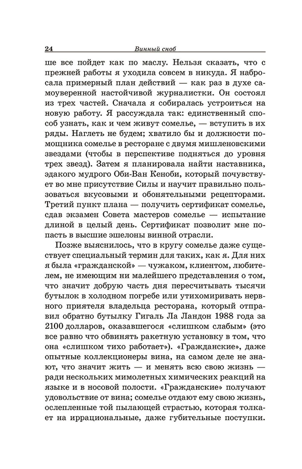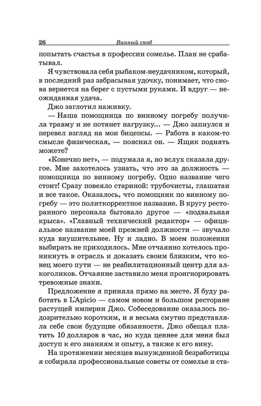 Целый год Бьянка Боскер изучала все, что связанно с миром виноделия и культурой дегустации этого напитка. Общалась с учеными, виноделами, коллекционерами редких бутылок вина, лучшими из лучших сомелье. И всеми накопленными знаниями щедро поделилась в книге «Винный сноб». Разве сомелье - это не те же официанты, только с иностранным названием, втюхивающие посетителям ресторанов дорогие бутылки? Автор книги «Винный сноб» тоже так думала, пока не погрузилась в изучение мира вина и не познакомилась с лучшими представителями профессии, для которых подавать вино - это не столько работа, сколько образ жизни во имя вкуса и удовольствия. Это не руководство по покупке вина и не ода традициям употребления. Это не столько путешествие от виноградной лозы до бокала, сколько путь от бокала по пищеводу - в дикий мир одержимости вином и любви к нему во всех его формах и со всеми изъянами. Это исследование прочной связи с напитком с 7000-летней историей, занимавшим почетное место на столе египетских фараонов, бедных крестьян, русских царей, магнатов с Уолл-стрит, добропорядочных родителей из мирных пригородов и китайских студентов. Готовьтесь отправиться за кулисы обеденных залов мишленовских ресторанов, на разгульные вакханалии, а также внутрь томографических сканеров и научных лабораторий. В этой книге речь идет не только о вине. Она скорее о том, как научиться слушать свои чувства, глубже ощущать и ценить окружающий мир. О профессии сомелье. Любой разумный человек, который покупает в магазине бутылку вина или заказывает ее в ресторане, хочет узнать, зачем ему тратить 150 долларов за алкогольный напиток, если за 15 долларов можно получить такое количество ферментированного сока. И каждый уважающий себя сомелье должен уметь ему это грамотно объяснить. Однако только на первый взгляд профессия сомелье выглядит сплошным удовольствием. Для того чтобы достичь существенных высот в этой сфере, необходимо пройти немыслимые испытания. Один экзамен на мастера сомелье чего стоит! Подробнее обо всех этапах на пути к профессии вы можете прочитать в книге. Скажем только, что проще, дешевле и быстрее отучиться на юридическом факультете, чем получить место сомелье в одном из лучших ресторанов. Любопытный факт! Самая дорогая бутылка вина в истории была продана в 2010 году за 304 375 долларов. Можно было купить дом, два полных курса учебы в колледже и пять внедорожников Porshe за те деньги, которые были потрачены на бутылку «Шато Шеваль Блан» 1947 года, которая, несмотря на звание «чистого совершенства», в конечном итоге будет уничтожена и превратится в чрезвычайно дорогую мочу.| Издательство | Попурри |