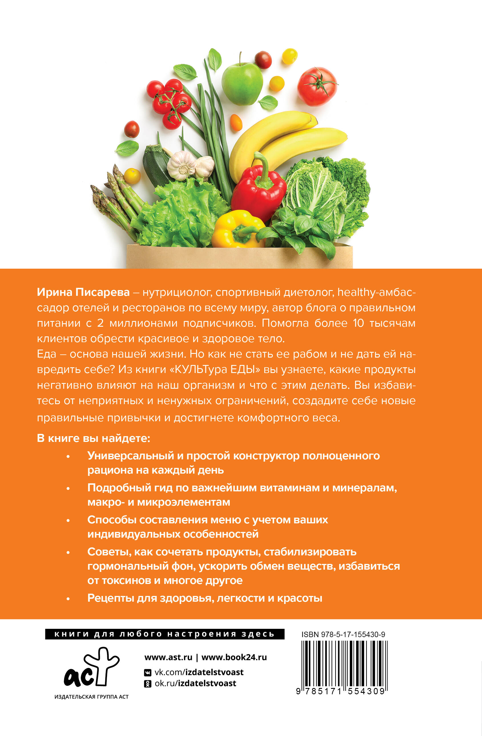 Ирина Писарева - нутрициолог, спортивный диетолог, healthy-амбассадор отелей и ресторанов по всему миру, автор блога о правильном питании с 2 миллионами подписчиков. Помогла более 10 тысячам клиентов обрести красивое и здоровое тело. Еда - основа нашей жизни. Но как не стать ее рабом и не дать ей навредить себе? Из книги "КУЛЬТура ЕДЫ" вы узнаете, какие продукты негативно влияют на наш организм и что с этим делать. Вы избавитесь от неприятных и ненужных ограничений, создадите себе новые правильные привычки и достигнете комфортного веса. В книге вы найдете: • Универсальный и простой конструктор полноценного рациона на каждый день • Подробный гид по важнейшим витаминам и минералам, макро- и микроэлементам • Способы составления меню с учетом ваших индивидуальных особенностей • Советы, как сочетать продукты, стабилизировать гормональный фон, ускорить обмен веществ, избавиться от токсинов и многое другое • Рецепты для здоровья, легкости и красоты| Издательство | ИЗДАТЕЛЬСТВО "АСТ" |
