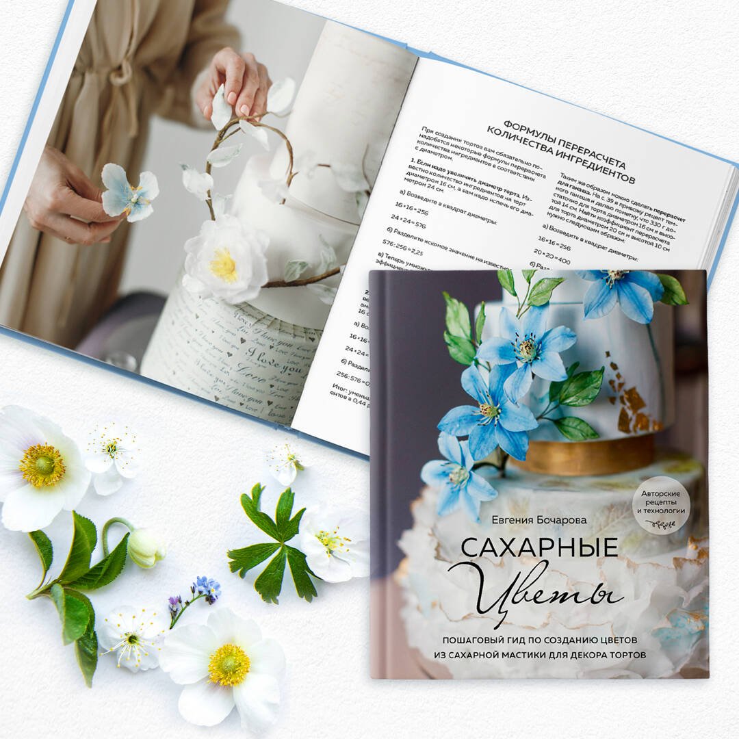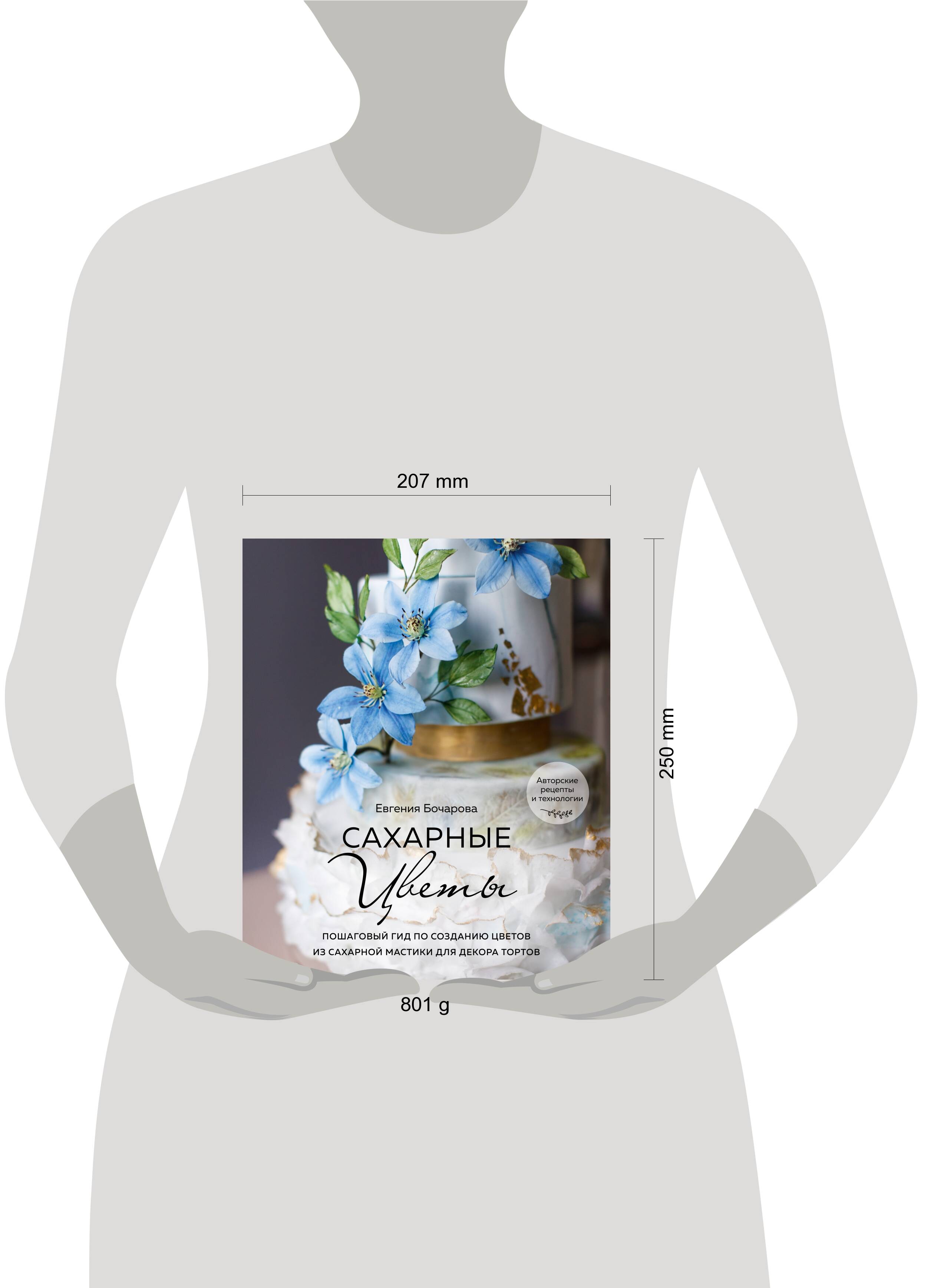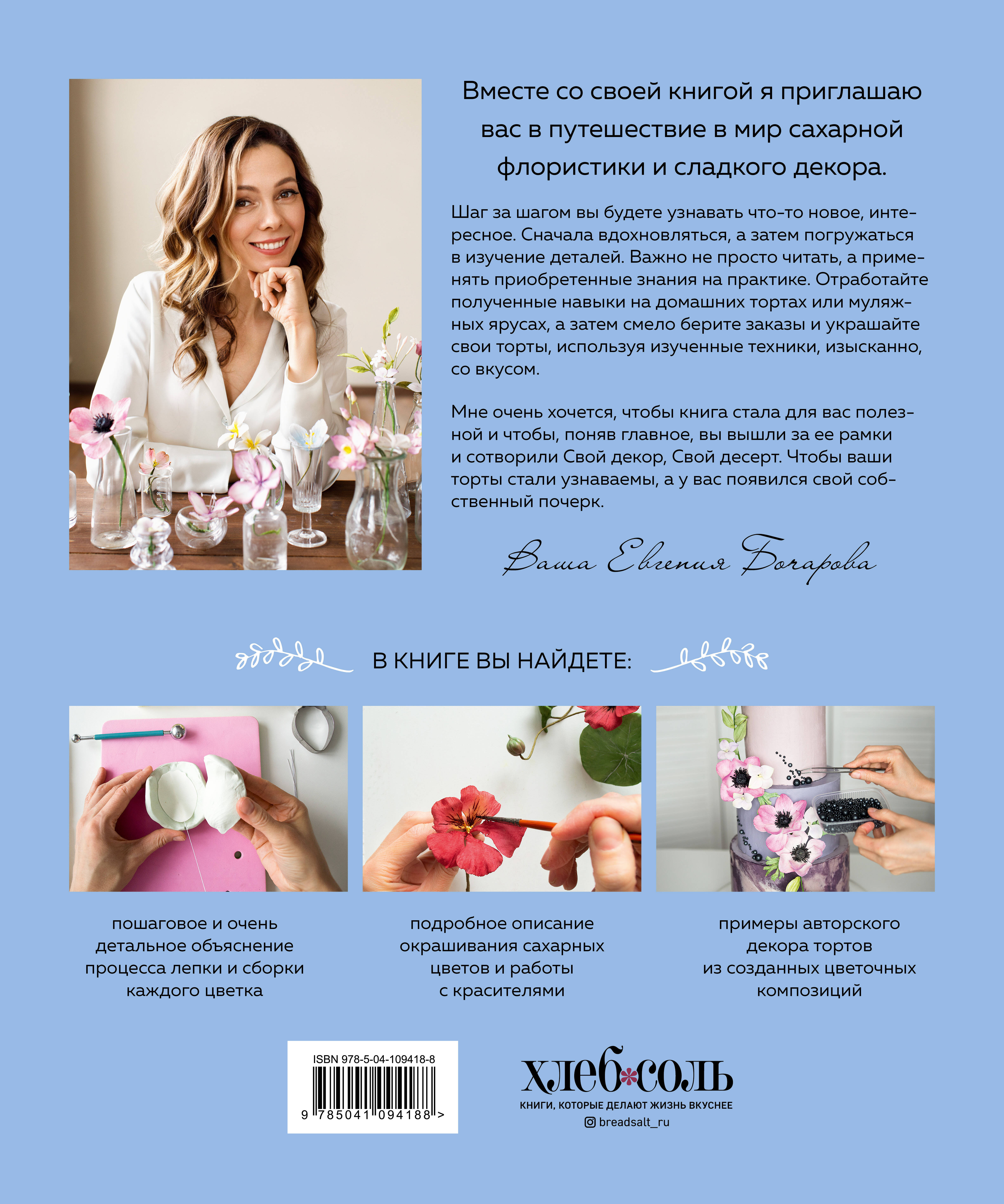 Хрупкие лилии, нежные пионы, яркие розы, трепетные магнолии и обворожительные анемоны застыли как живые. Сахарная флористика позволяет выполнить необыкновенные композиции для украшения тортов от самых простых цветов до экзотических букетов. Безусловно, создание цветочных композиций из сахарной мастики, вафельной бумаги или шоколада - дело не простое и самостоятельно получить достойный результат сложно, тут вам обязательно нужно экспертное мнение человека, который собрал воедино базу, подробный разбор инструментария, приемы и техники, основы работы с красителями, схемы окрашивания и свой многолетний опыт в вопросе. Все эти моменты вы откроете для себя в дебютной книги Евгении Бочаровой, которая с самых азов научит вас творить дивные украшения для тортов и расскажет, как создать цветочное настроение вашему празднику. В книге вы найдете пошаговые инструкции для создания сахарных цветов, рецепты тортов, способы сборки сложных конструкций тортов, а также контурные схемы цветов для того, чтобы вы смогли сочинить свой собственный цветочный шедевр.