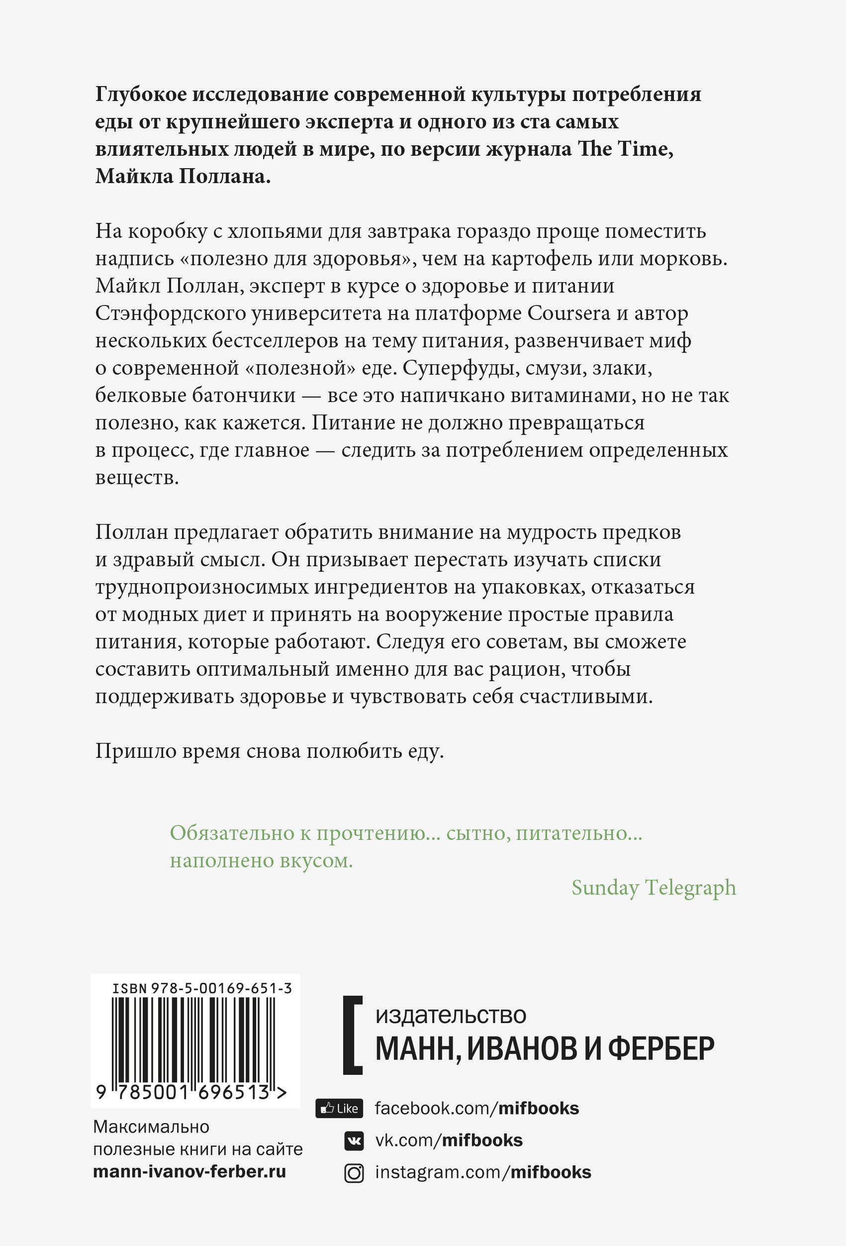 Глубокое исследование современной культуры потребления еды от эксперта Майкла Поллана. Под едой автор понимает здоровую, настоящую, простую пищу, а не ту, что мы видим в магазинах - в привлекательных упаковках и заявленную как полезная для здоровья. В своей книге он призывает перестать изучать списки труднопроизносимых ингредиентов на упаковках, отказаться от модных диет и заново разобраться, что же такое правильное и здоровое питание. Следуя его простым советам, вы сможете составить оптимальный именно для вас рацион, чтобы поддерживать здоровье и чувствовать себя счастливыми. Пришло время снова полюбить еду. Для кого эта книга: Для всех, кто заботится о правильном питании для себя и своих близких. Для тех, кто опробовал множество диет и хочет найти оптимальный для себя подход к питанию.| Издательство | МАНН, ИВАНОВ И ФЕРБЕР ООО |