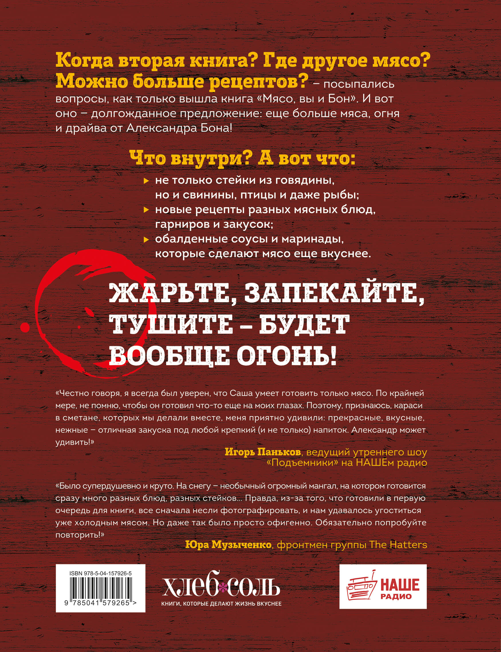 Новая книга Александра Бона - это настоящий мясной праздник. Вы спрашивали, вы хотели, вы требовали, и вот - не только стейки, но и целая гора другого мяса: свинина, птица, рыба. И, конечно, говядина. Что ждет вас в этой книге: - почти 40 горячих рецептов: новые стейки, нежнейшая говяжья голяшка, свиные ребрышки, утка с хрустящей корочкой, лосось по-японски и многое другое; - идеальные гарниры, закуски и даже супы, пока компания томится в ожидании доброго куска мяса; - новые жизненные истории, которые развеселят вас в перерыве между готовкой; - и, как обычно, ни грамма лишней «воды» - чистейший мясной сок. На гриле, на сковороде, в духовке - готовьте везде! Гарантируем: будет вообще огонь!| Издательство | ООО "Издательство "Эксмо" |