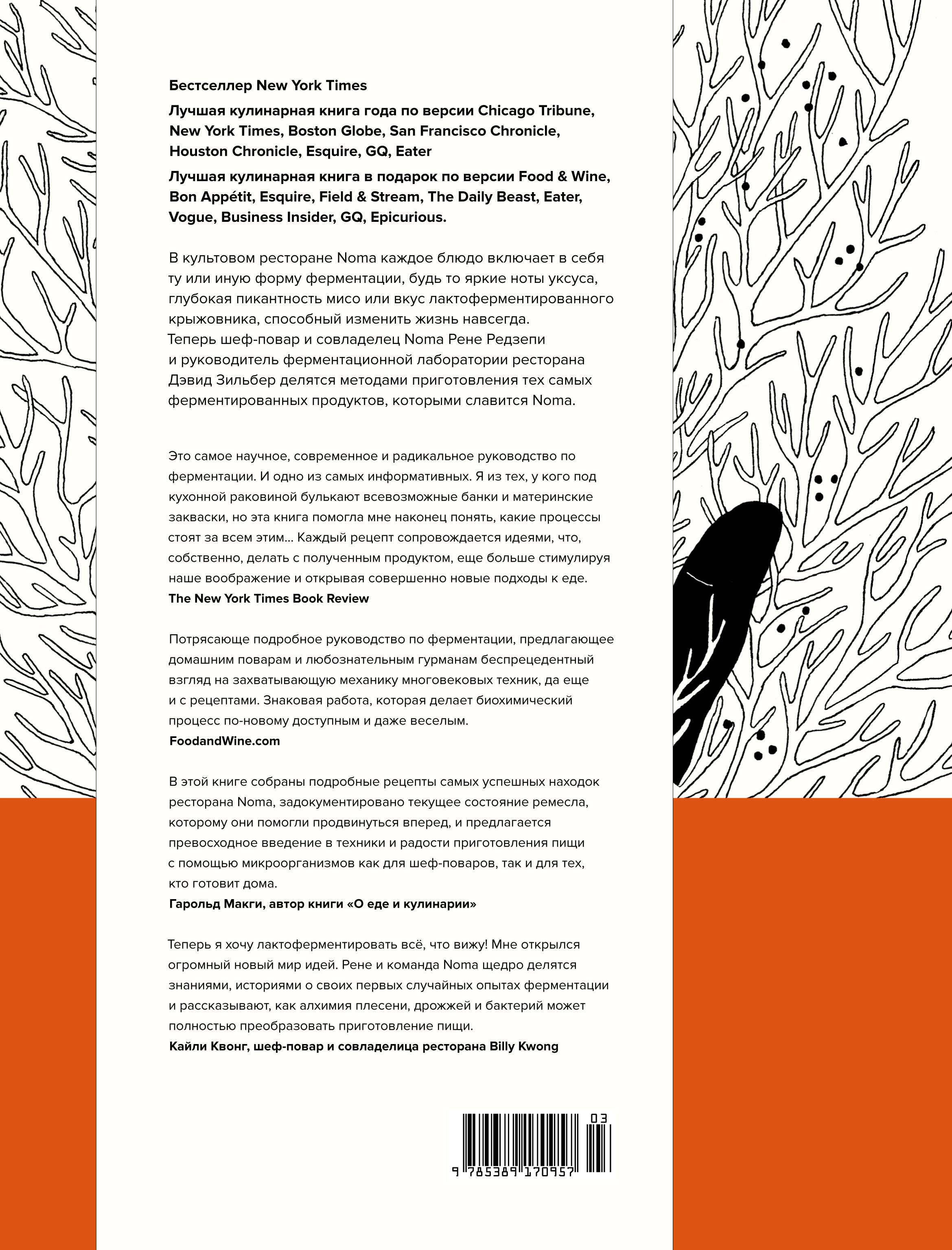 В Noma - культовом копенгагенском ресторане, отмеченном двумя мишленовскими звездами и четырежды признанном лучшим в мире, - каждое блюдо включает в себя ту или иную форму ферментации, будь то яркие ноты уксуса, глубокая пикантность мисо, электризующая капля гарума или интенсивная сладость черного чеснока. Ферментация (брожение, квашение) - пожалуй, самый модный и полезный тренд в современной кулинарии; это основа, стоящая за уникальными вкусами кухни Noma. Шеф-повар и совладелец Noma Рене Редзепи и руководитель знаменитой ферментационной лаборатории ресторана Дэвид Зильбер впервые раскрывают свои секреты и делятся методами приготовления тех самых ферментированных продуктов, которыми славится Noma. Это руководство невероятно расширит ваши кулинарные горизонты, ведь ферментация - это далеко не только квашеная капуста: вас ждут кодзи, комбуча, сёйю, мисо, лактоферментированные продукты, разные виды уксуса, гарумы из рыбы и мяса и даже черные фрукты и овощи. Что не менее важно, Редзепи и Зильбер с помощью более 100 оригинальных рецептов показывают, как использовать эти удивительные ингредиенты в конкретных блюдах - и тем самым преобразить вашу готовку. В книге более 500 цветных пошаговых фотографий и иллюстраций, а все рецепты тщательно протестированы в лаборатории Noma. "Ферментация не знает границ. В Дании она - такая же часть кулинарной традиции, как в Италии, в Японии или в Китае. Без ферментации нет кимчи, нет мягкого хлеба на закваске, нет пармезана, нет вина, пива или крепкого алкоголя, нет солений, нет соевого соуса. Нет ни соленой сельди, ни ржаного хлеба. Без ферментации нет Noma. Наш ресторан всегда ассоциировался у людей с "дикой" едой и собирательством, однако на самом деле краеугольный камень Noma - ферментация". (Рене Редзепи, Дэвид Зильбер)| Издательство | Азбука-Аттикус Издат.группа ООО |