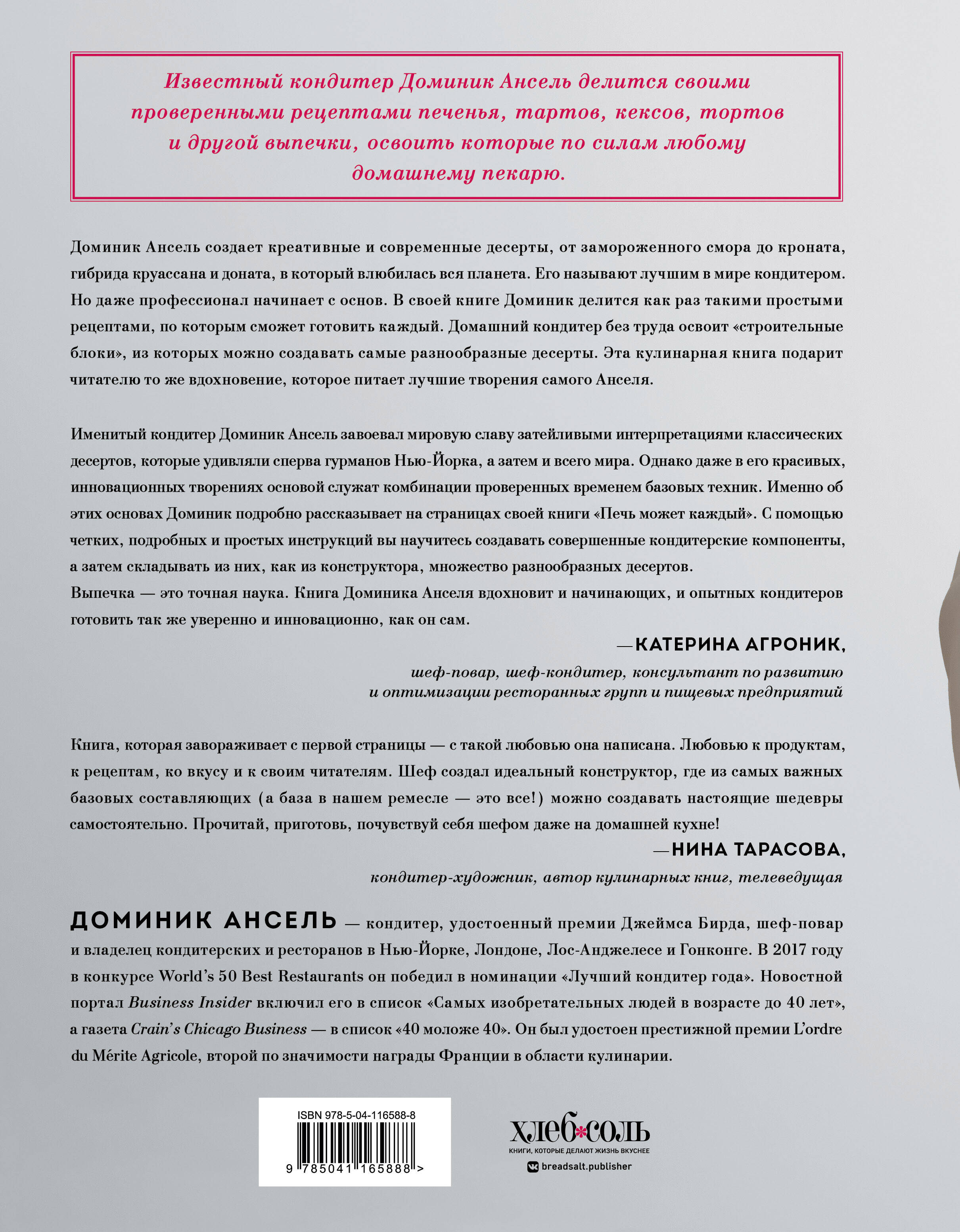 Доминик Ансель, шеф-кондитер и лауреат премии Джеймса Бирда, потряс мир выпечки своей инновационной и креативной работой. Владелец и бренд-шеф сети кондитерских в Нью-Йорке, Лондоне и Лос-Анджелесе, носящей его имя, шеф Доминик создает, пожалуй, самую изысканную выпечку в мире, включая кронаты® (названные журналом TIME «одним из 25 лучших изобретений 2013 года»), печенье-шоты, замороженный смор, «цветущий» горячий шоколад и многое другое. За свою невероятную креативность был назван лучшим шефом-кондитером мира в 2017 году по версии World's 50 Best Restaurants awards. Журнал Food & Wine назвал его «Ван Гогом кулинарии», а New York Post «Нью-йоркским Вилли Вонка». В своей второй книге Доминик делает не только личное публичным, но и впервые делится своими секретными рецептами шеф-кондитера. Несмотря на обилие книг данной тематики, как отечественных, так и переводных, данное издание выгодно выделяется на общем фоне за счет необычного принципа, лежащего в основе: читателю предлагается не традиционный набор рецептов, а своеобразный «кондитерский конструктор», позволяющий после освоения базовых рецептов и техник создавать неограниченное количество вариантов сладкой выпечки, комбинируя разные основы, начинки и топпинги.| Издательство | ООО "Издательство "Эксмо" |