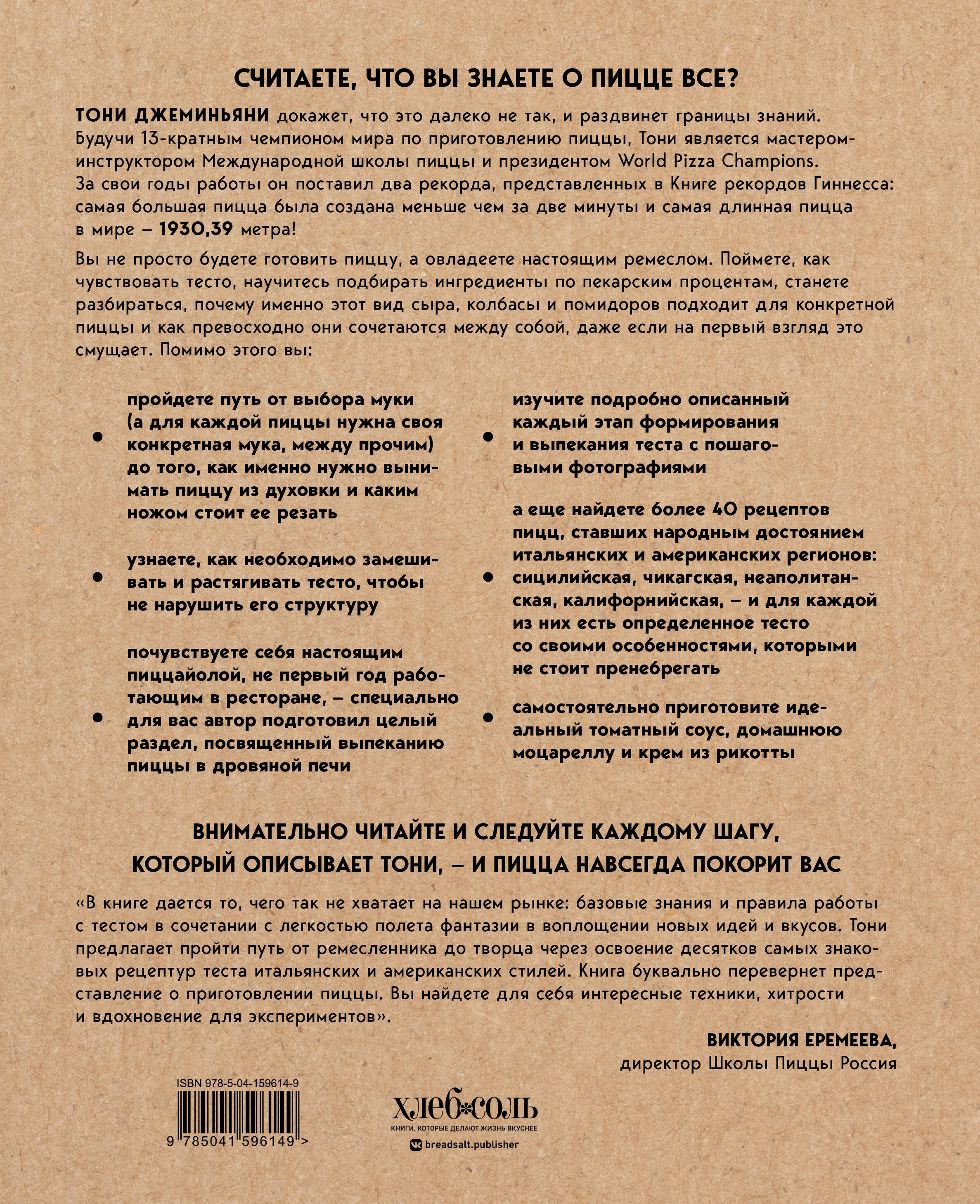 Легендарная книга, посвященная секретам приготовления пиццы, теперь на русском языке! Обладатель множества наград - Чемпион мира по приготовлению пиццы, лучшая пицца США, самая длинная пицца в мире в Книге рекордов Гиннесса - Тони Джеминьяни обучит вас всем тонкостям и расскажет, как приготовить самую вкусную пиццу ресторанного уровня в домашних условиях. На страницах «Библии пиццы» автор делится огромной теоретической базой, которую он прорабатывал в течение многих лет и благодаря которой вы сможете найти и приготовить свою любимую пиццу: сицилийская, аутентичные «Маргарита», чикагская закрытая, калифорнийскую ЗОЖ-пиццу на закваске из отрубей. Помимо этого вы узнаете рецепт домашней моцареллы, самого сочного томатного соуса, домашней колбасы и десятка различных соусов, которые отлично подойдут к любой пицце. Самые настоящие ценители даже смогут приготовить пиццу в дровяной печи, как настоящие пиццайоло. Окунитесь в этот удивительный мир румяного теста, идеально тянущегося сыра и острых впечатлений - и вы уже никогда не сможете оторваться от кусочка той самой пиццы.| Издательство | ООО "Издательство "Эксмо" |