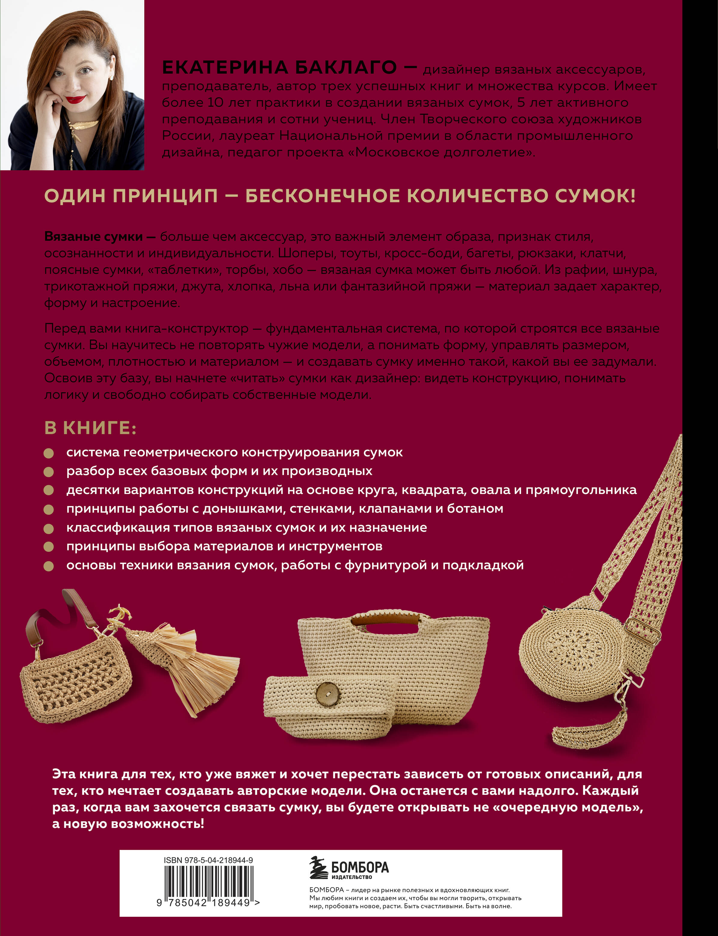 Одна книга - тысячи идей. Один принцип - бесконечное количество сумок. Вязаные сумки сегодня - это больше, чем модный тренд. Это способ выразить стиль, характер и индивидуальность. Они легко вписываются в городской или отпускной гардероб, становятся акцентом образа или его основой, переходят из повседневного формата в вечерний и обратно. Шопперы и тоуты, кросс-боди и багеты, рюкзаки, клатчи, поясные сумки, «таблетки» и торбы - вязаная сумка может быть любой. Жесткой или мягкой. Лаконичной или декоративной. Из рафии, шнура, трикотажной пряжи, джута, хлопка или льна. Но за всем этим разнообразием всегда стоит одно - понятная конструкция. Перед вами не сборник мастер-классов и не каталог готовых моделей. Это книга-конструктор, созданная для тех, кто хочет не повторять, а создавать и моделировать. Екатерина Баклаго предлагает системный подход к вязанию сумок: через геометрию формы, логику конструкции и понимание материала. Любая, даже самая сложная сумка, разбирается на простые элементы - круг, квадрат, овал, прямоугольник. Освоив эту базу, вы сможете собирать собственные модели - нужного размера, формы и плотности, из той пряжи, которая есть именно у вас. Это книга о свободе творчества и уверенности в результате. Почему эта система работает? Методика основана на более чем 10-летнем опыте автора в дизайне вязаных сумок и преподавании. Она рождалась на живых уроках, в диалоге с ученицами, из сотен вопросов: как изменить размер, как выбрать материал, как придумать форму и не ошибиться. Здесь нет случайных решений - только выверенные принципы, которые помогают избежать типичных ошибок и получать предсказуемый, красивый результат. Что вы найдете в книге: - систему геометрического конструирования вязаных сумок; - разбор всех базовых форм и вариантов их сочетаний; - конструкции донышек, стенок, клапанов и ботана; - классификацию типов сумок и их назначение; - осознанный выбор материалов: рафия, шнур, трикотажная пряжа, джут, хлопок, лен; - выбор инструментов и технику вязания, правила чтения схем; - обзор фурнитуры, технологию работы с подкладкой и даже основы брендирования. Эта книга: - Для тех, кто мечтает бесконечно дополнять свой гардероб стильными аксессуарами. - Для тех, кто уже имеет опыт вязания и кому тесно в рамках готовых описаний. - Для мастеров, которые хотят создавать авторские модели, понимать логику формы и чувствовать уверенность в каждом этапе работы. - Для тех, кто мечтает собрать собственную коллекцию сумок, а не остановиться на одной модели. Вы перестанете бояться экспериментов, начнете понимать принципы конструкции сумок, сможете создавать модели под свои задачи, стиль и материал - снова и снова. Эта книга не заканчивается на последней странице. Она остается с вами как инструмент, к которому вы будете возвращаться каждый раз, когда в руки попадает крючок и появляется новая идея. Один конструктор - бесконечный полет фантазии.