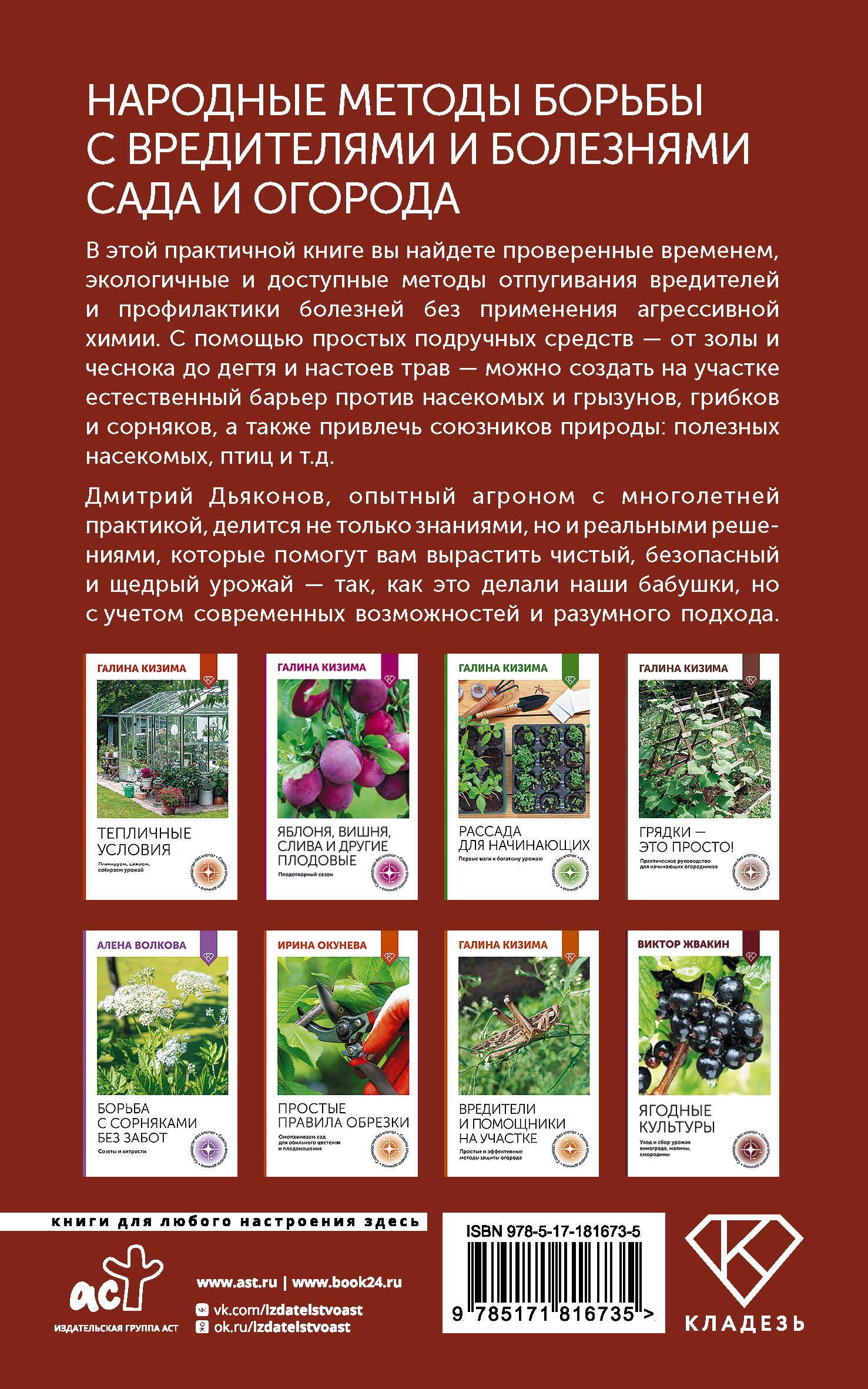 В этой практичной книге вы найдете проверенные временем, экологичные и доступные методы отпугивания вредителей и профилактики болезней без применения агрессивной химии. С помощью простых подручных средств - от золы и чеснока до дегтя и настоев трав - можно создать на участке естественный барьер против насекомых и грызунов, грибков и сорняков, а также привлечь союзников природы: полезных насекомых, птиц и т.д. Дмитрий Дьяконов, опытный агроном с многолетней практикой, делится не только знаниями, но и реальными решениями, которые помогут вам вырастить чистый, безопасный и щедрый урожай - так, как это делали наши бабушки, но с учетом современных возможностей и разумного подхода.| Издательство | Издательство "АСТ" |