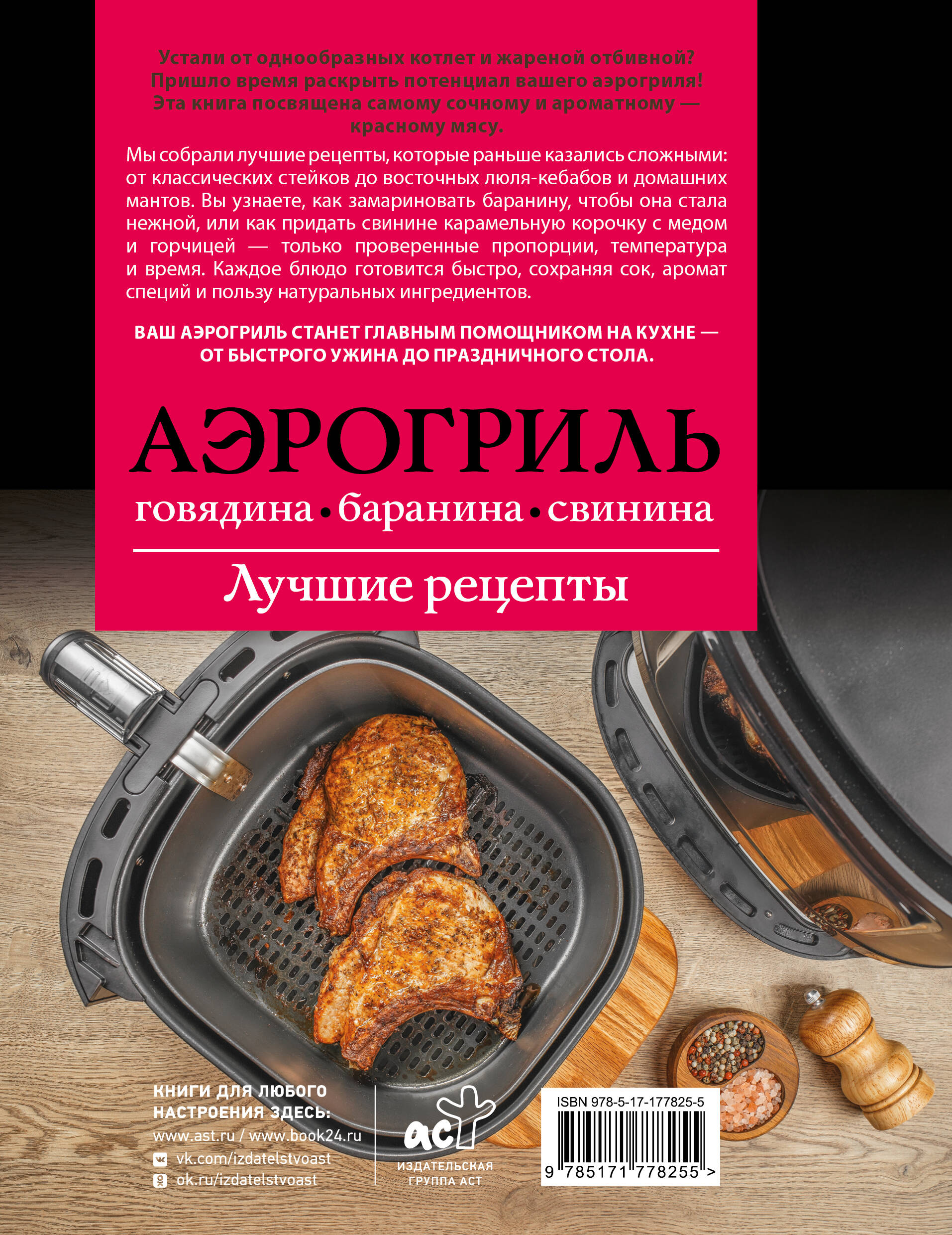 Устали от однообразных котлет и жареной отбивной? Пришло время раскрыть потенциал вашего аэрогриля! Эта книга посвящена самому сочному и ароматному - красному мясу. Мы собрали лучшие рецепты, которые раньше казались сложными: от классических стейков до восточных люля-кебабов и домашних мантов. Вы узнаете, как замариновать баранину, чтобы она стала нежной, или как придать свинине карамельную корочку с медом и горчицей - только проверенные пропорции, температура и время. Каждое блюдо готовится быстро, сохраняя сок, аромат специй и пользу натуральных ингредиентов. Ваш аэрогриль станет главным помощником на кухне - от быстрого ужина до праздничного стола.| Издательство | Издательство "АСТ" |