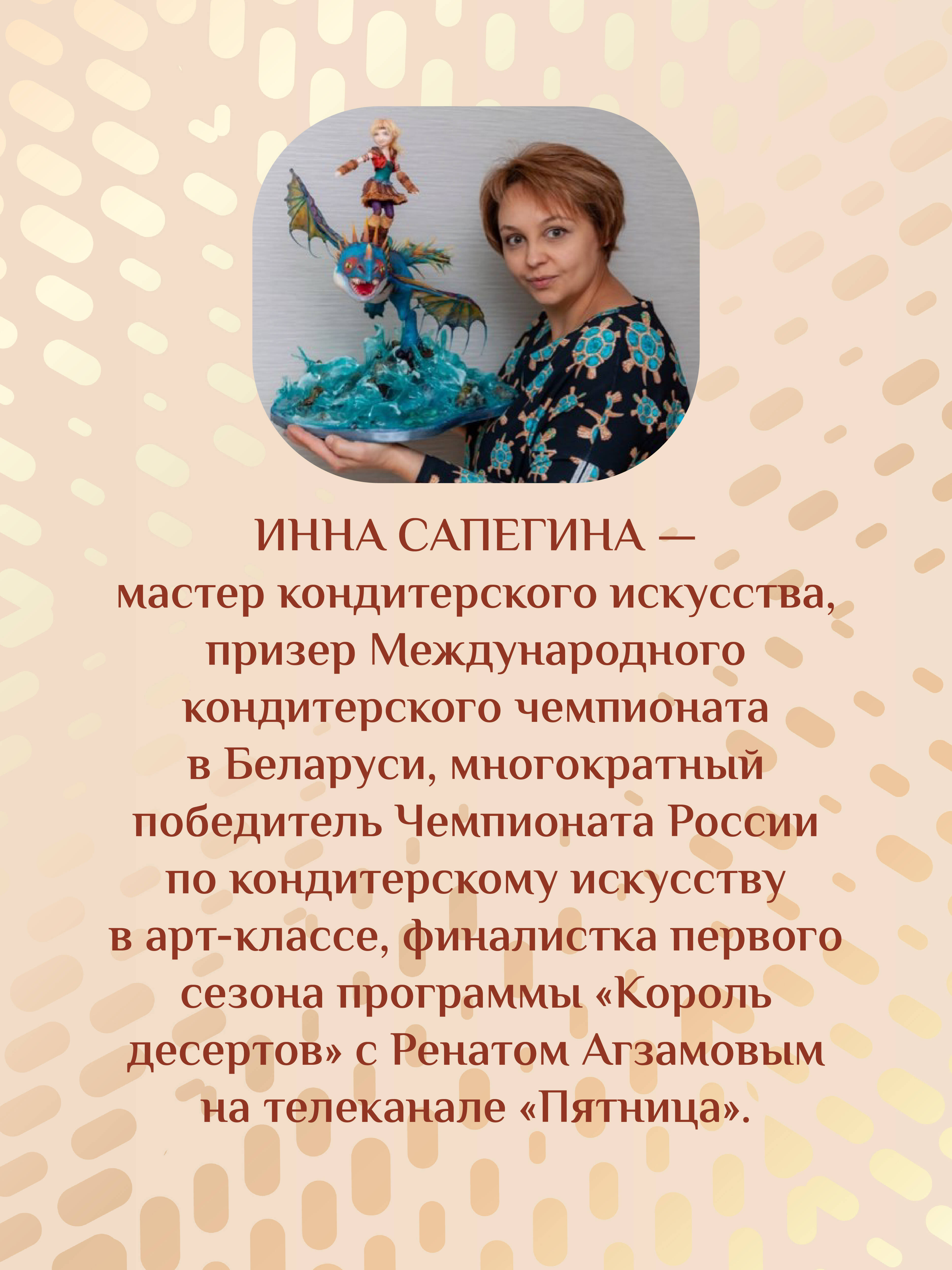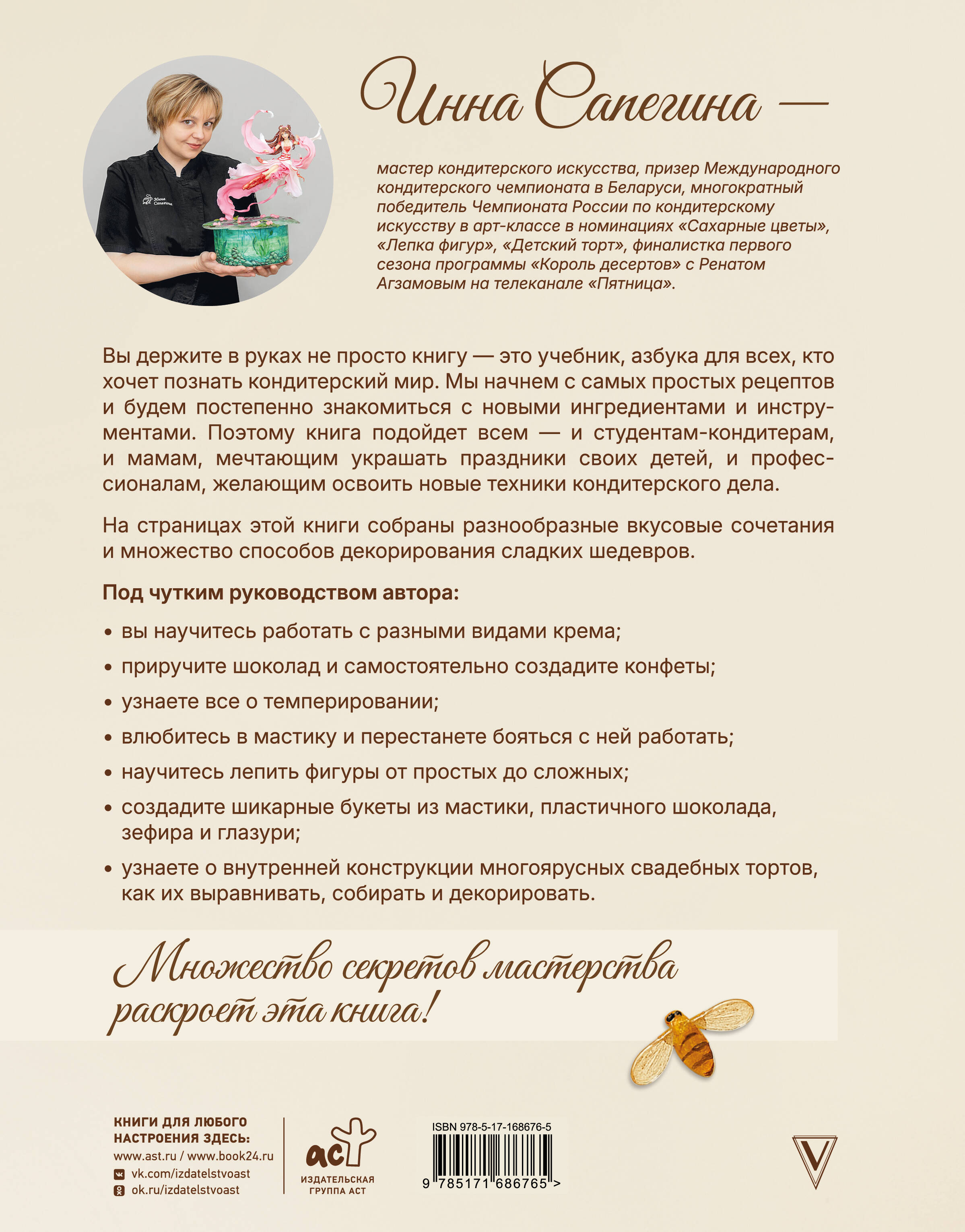 Инна Сапегина - мастер кондитерского искусства, призер Международного кондитерского чемпионата в Беларуси, многократный победитель Чемпионата России по кондитерскому искусству в арт-классе в номинациях "Сахарные цветы", "Лепка фигур", "Детский торт", финалистка первого сезона программы "Король десертов" с Ренатом Агзамовым на телеканале "Пятница". Вы держите в руках не просто книгу - это учебник, азбука для всех, кто хочет познать кондитерский мир. Мы начнём с самых простых рецептов и будем постепенно знакомиться с новыми ингредиентами и инструментами. Поэтому книга подойдёт всем, и студентам-кондитерам, и мамам, мечтающим украшать праздники своих детей, и профессионалам, желающим освоить новые техники кондитерского дела. На страницах этой книги собраны разнообразные вкусовые сочетания и множество способов декорирования сладких шедевров. Под чутким руководством автора: • вы научитесь работать с разными видами крема; • приручите шоколад и самостоятельно создадите конфеты; • узнаете все о темперировании; • влюбитесь в мастику и перестанете бояться с ней работать; • научитесь лепить фигуры от простых до сложных; • создадите шикарные букеты из мастики, пластичного шоколада, зефира и глазури; • узнаете о внутренней конструкции многоярусных свадебных тортов, как их выравнивать, собирать и декорировать. Множество секретов мастерства раскроет эта книга!| Издательство | Издательство "АСТ" |