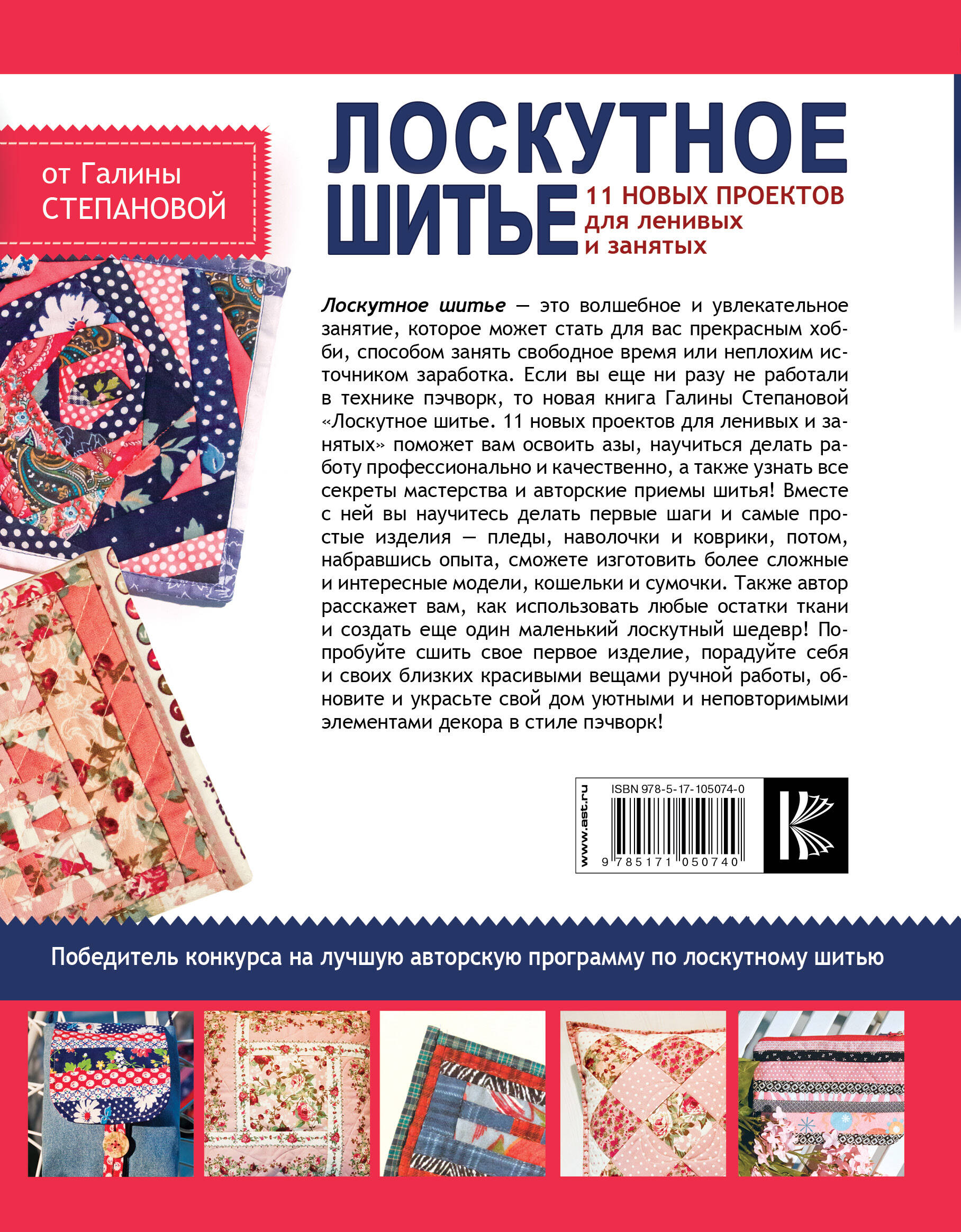 Новая книга Галины Степановой поможет всем желающим освоить азы техники пэчворк, научиться делать работу профессионально и качественно, а также узнать все секреты мастерства и авторские приемы шитья! Книга предназначена для рукодельниц разного уровня мастерства. Благодаря подробному описанию работы и пошаговым иллюстрациям, читатели легко научатся основным приемам шитья и смогут изготовить простые изделия: плед, наволочки, коврики и прихватки. А потом, набравшись опыта, перейдут к более сложным моделям: кошелькам и сумочкам. Кроме того, автор раскрывает секреты, как использовать любые остатки ткани для создания очередных лоскутных шедевров. Книга поможет всем желающим открыть в себе творческие способности, украсить свой дом уютными вещами в стиле пэчворк и создать красивые подарки ручной работы для близких людей. Лоскутное шитье - это волшебное и увлекательное занятие, которое может стать прекрасным хобби, способом с пользой провести свободное время или сделаться неплохим источником заработка.