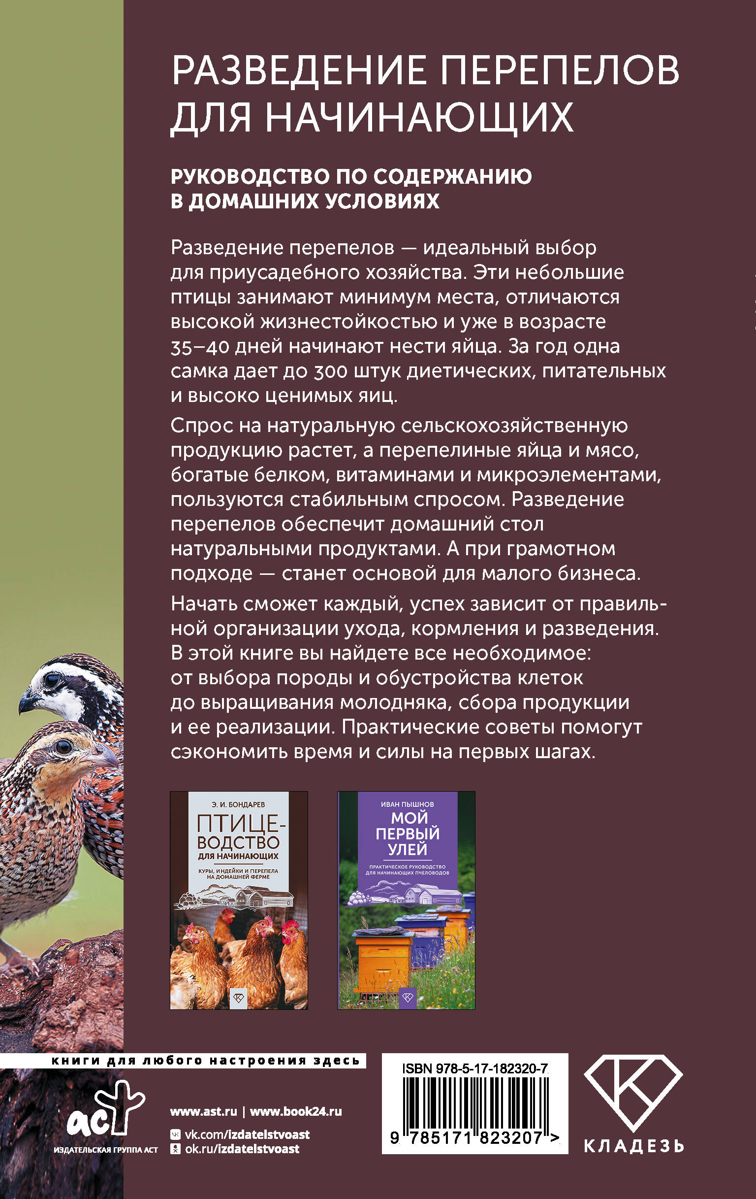 Разведение перепелов - идеальный выбор для приусадебного хозяйства. Эти небольшие птицы занимают минимум места, отличаются высокой жизнестойкостью и уже в возрасте 35-40 дней начинают нести яйца. За год одна самка дает до 300 штук диетических, питательных и высоко ценимых яиц. Спрос на натуральную сельскохозяйственную продукцию растет, а перепелиные яйца и мясо, богатые белком, витаминами и микроэлементами, пользуются стабильным спросом. Разведение перепелов обеспечит домашний стол натуральными продуктами. А при грамотном подходе - станет основой для малого бизнеса. Начать сможет каждый, успех зависит от правильной организации ухода, кормления и разведения. В этой книге вы найдете все необходимое: от выбора породы и обустройства клеток до выращивания молодняка, сбора продукции и ее реализации. Практические советы помогут сэкономить время и силы на первых шагах.| Издательство | Издательство "АСТ" |