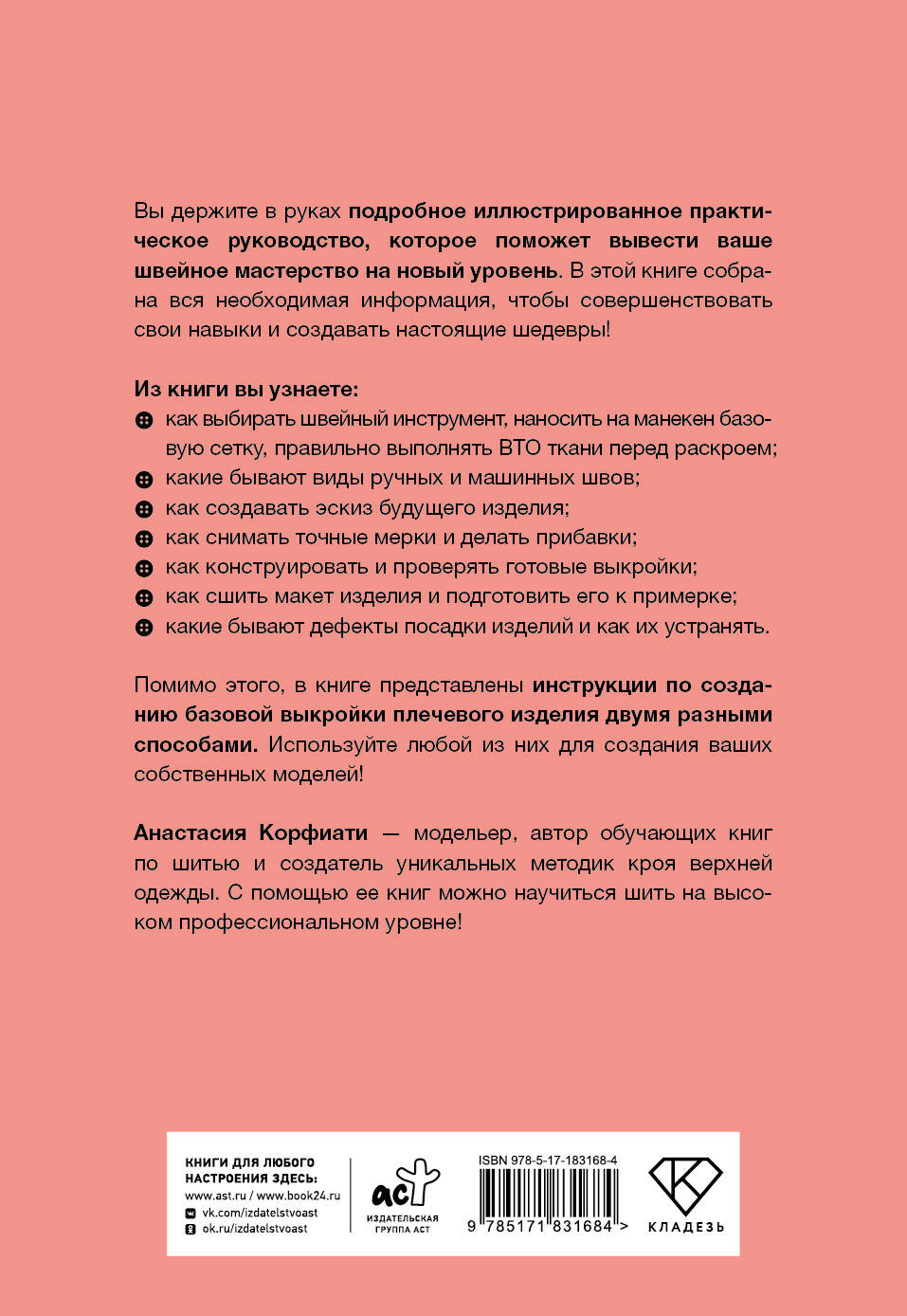 Это подробное практическое руководство кройки и шитья. С его помощью вы научитесь создавать художественные рисунки и технические эскизы, обрабатывать ткани и готовить изделия к примерке, освоите макетирование на манекене и научитесь исправлять дефекты. Подробные иллюстрации, пошаговые инструкции и советы от автора будут полезны новичкам и профессионалам. Они помогут совершенствовать навыки и достигать безупречного результата! Анастасия Корфиати - модельер, автор обучающих книг по шитью и создатель уникальных методик кроя верхней одежды.| Издательство | Издательство "АСТ" |
