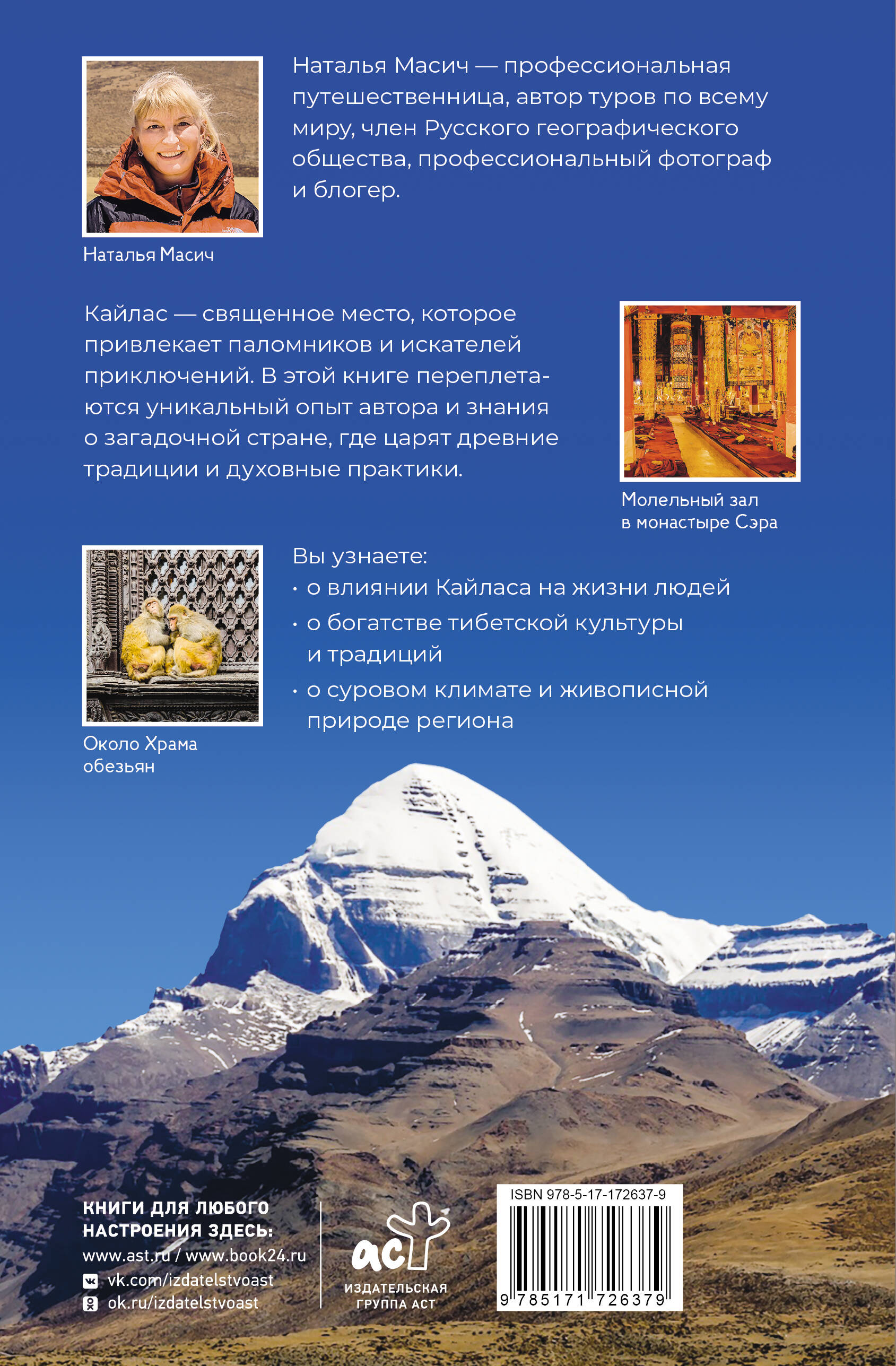 Наталья Масич - профессиональная путешественница, автор туров по всему миру, член Русского географического общества, профессиональный фотограф и блогер. Кайлас - священное место, которое привлекает паломников и искателей приключений. В этой книге переплетаются уникальный опыт автора и знания о загадочной стране, где царят древние традиции и духовные практики. Вы узнаете: • о влиянии Кайласа на жизни людей • о богатстве тибетской культуры и традиций • о суровом климате и живописной природе региона| Издательство | Издательство "АСТ" |