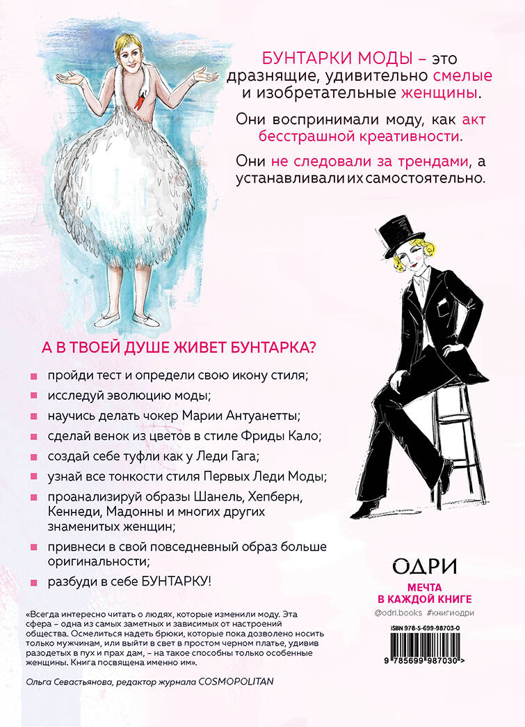 Пока их подруги попивали чай, откинув мизинчик, и следовали за модными тенденциями, они сами создавали эти тенденции. Кем были эти первооткрывательницы, которые придумали чокеры, остроносые туфли, мясные платья, облачили женщин в тельняшки и добавили шика, надев чулки со швом. Книга не только рассказывает о модных открытиях, но и дает инструкции о том, как самостоятельно повторить гениальные изобретения знаменитых бунтарок.| Издательство | ООО "Издательство "Эксмо" |