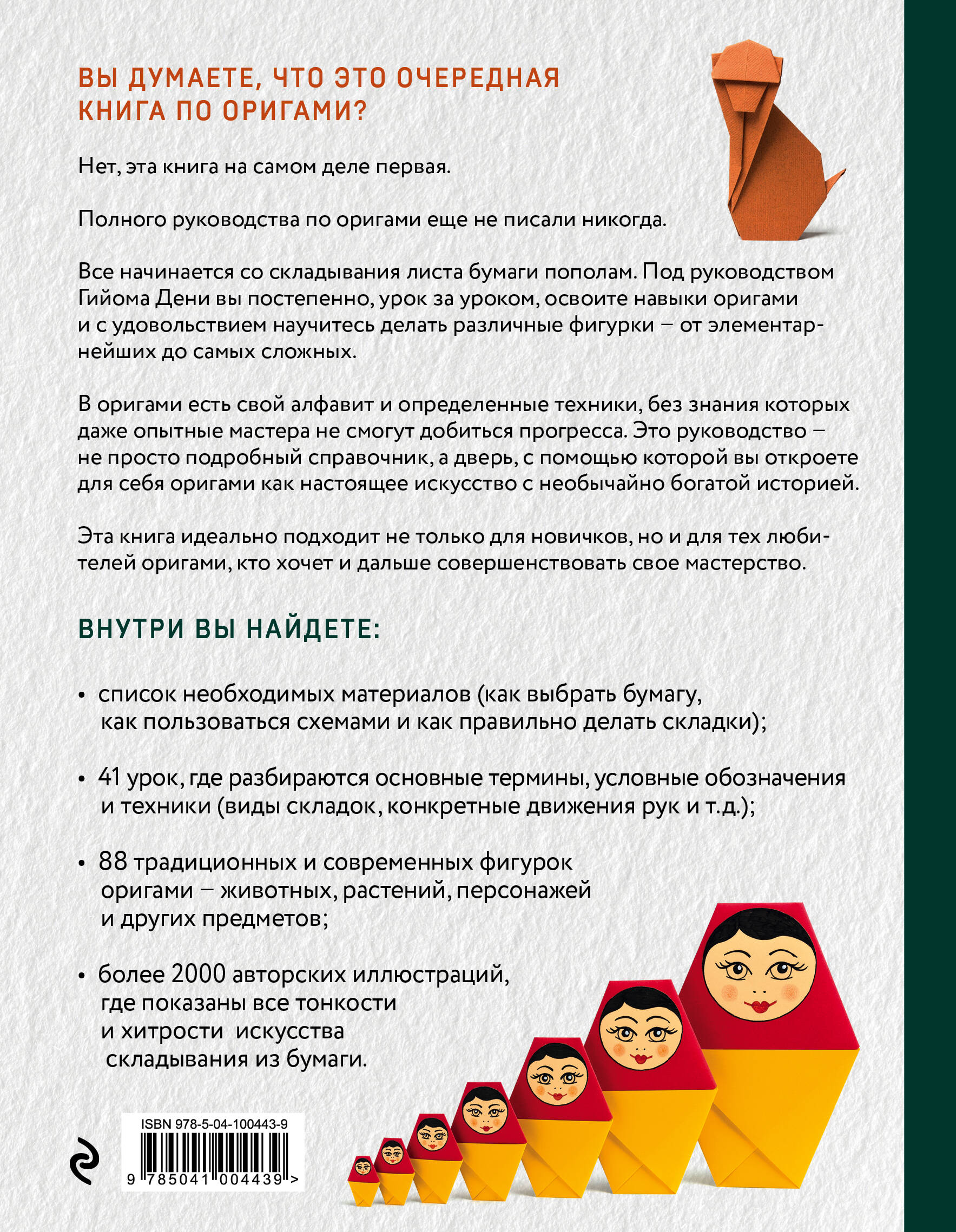 Более полного обучающего курса по оригами вы еще не видели. В книге вы найдете: - список необходимых материалов (как выбрать бумагу, как пользоваться схемами и как правильно делать складки); - 41 урок, где разбираются основные термины, условные обозначения и техники (виды складок, конкретные движения рук и т.д.); - 88 традиционных и современных фигурок оригами - животных, растений, персонажей и других предметов; - более 2000 авторских иллюстраций, где показаны все тонкости и хитрости искусства складывания из бумаги.| Издательство | ООО "Издательство "Эксмо" |