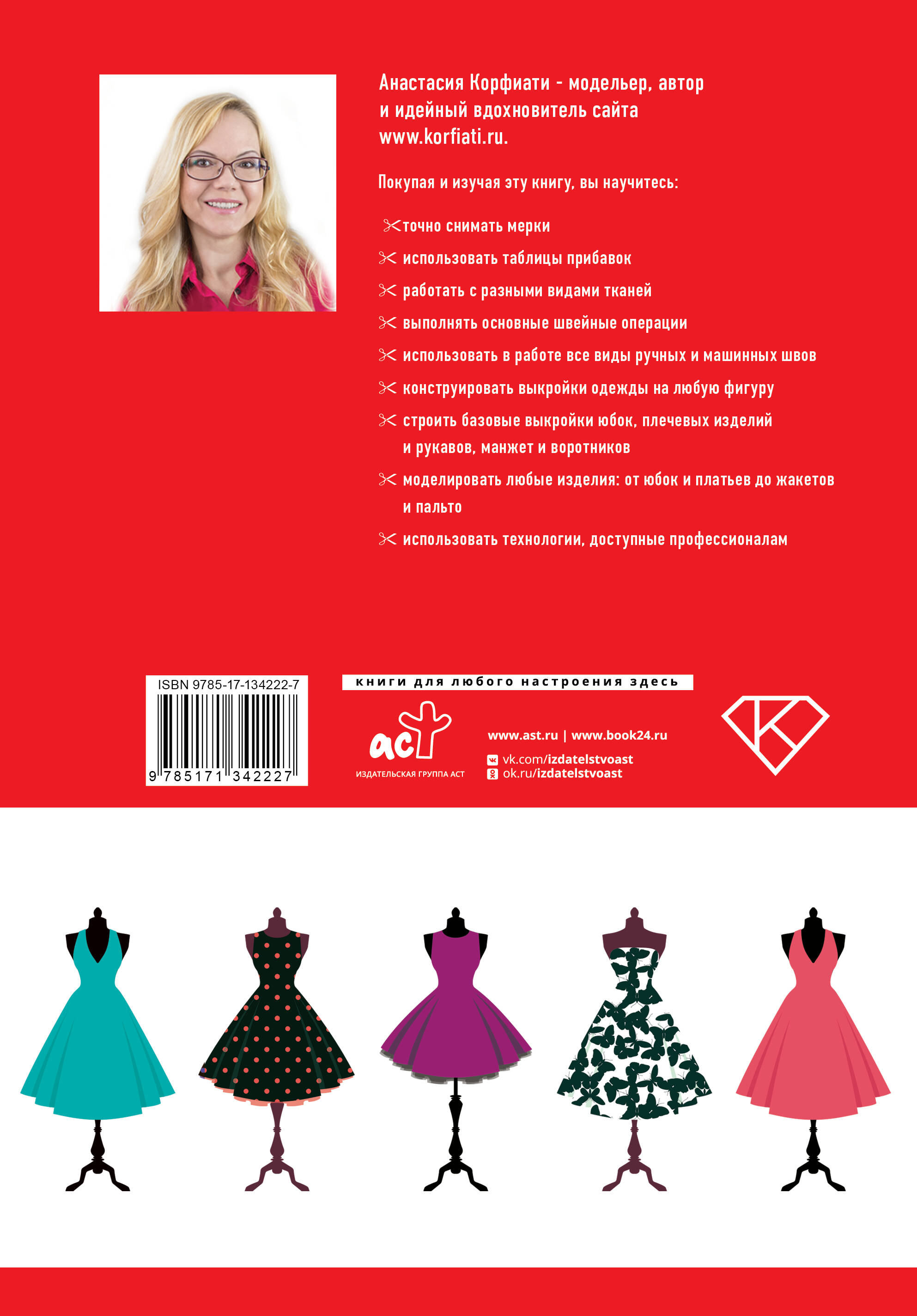 Анастасия Корфиати - модельер, автор и идейный вдохновитель сайта «Школа шитья Анастасии Корфиати» www.korfiati.ru. Покупая и изучая эту книгу, вы научитесь: - точно снимать мерки - использовать таблицы прибавок - работать с разными видами тканей - выполнять основные швейные операции - использовать в работе все виды ручных и машинных швов - конструировать выкройки одежды на любую фигуру - строить базовые выкройки юбок, плечевых изделий и рукавов, манжет и воротников - моделировать любые изделия: от юбок и платьев до жакетов и пальто - использовать технологии, доступные профессионалам| Издательство | Издательство "АСТ" |